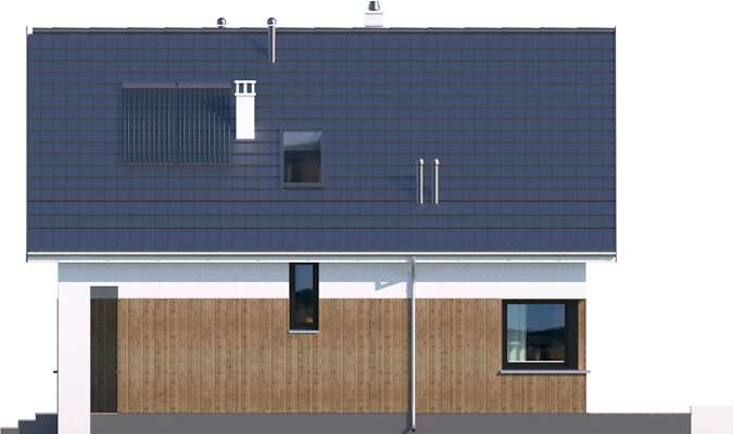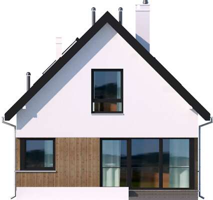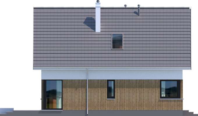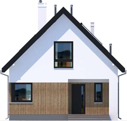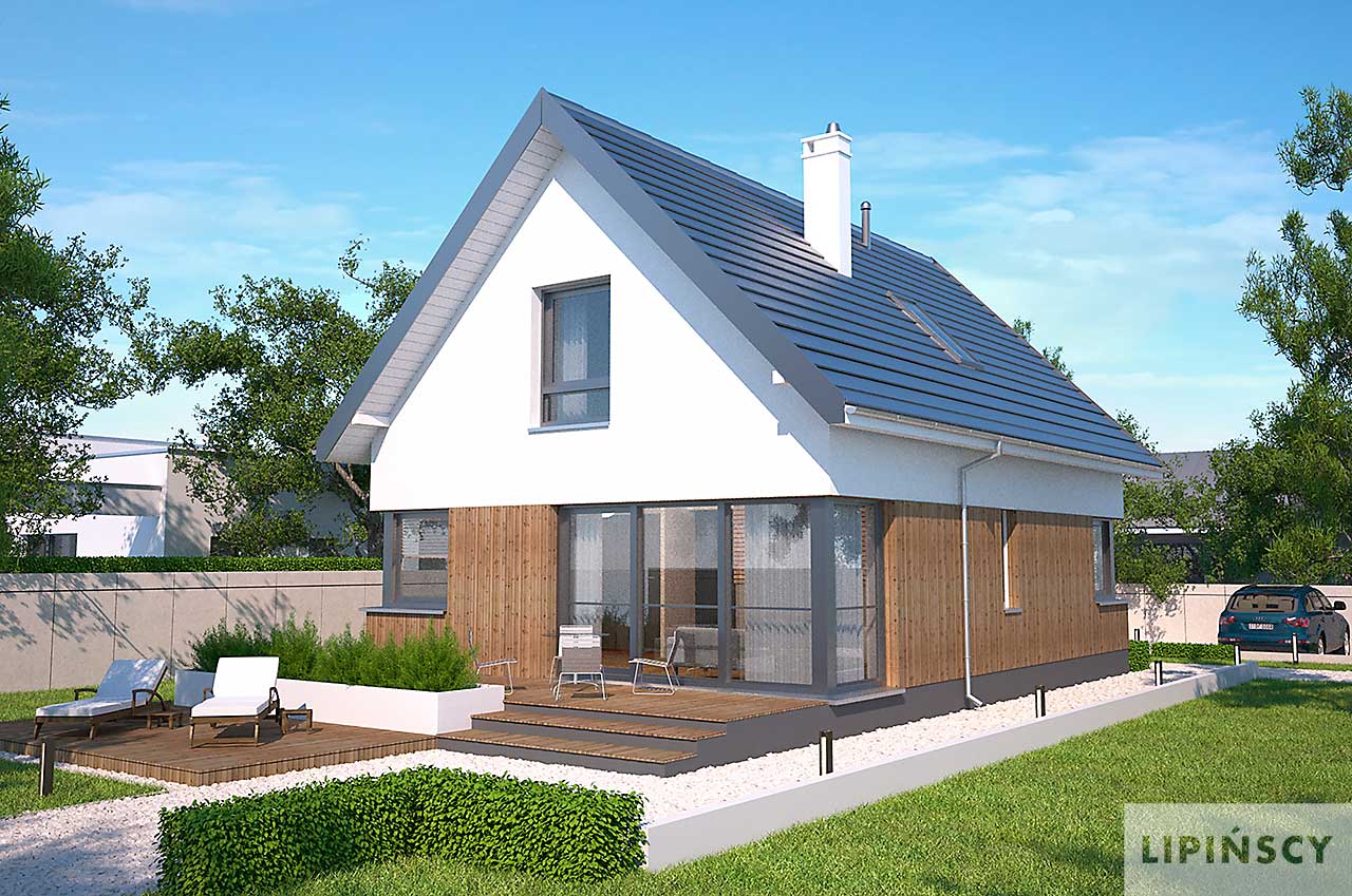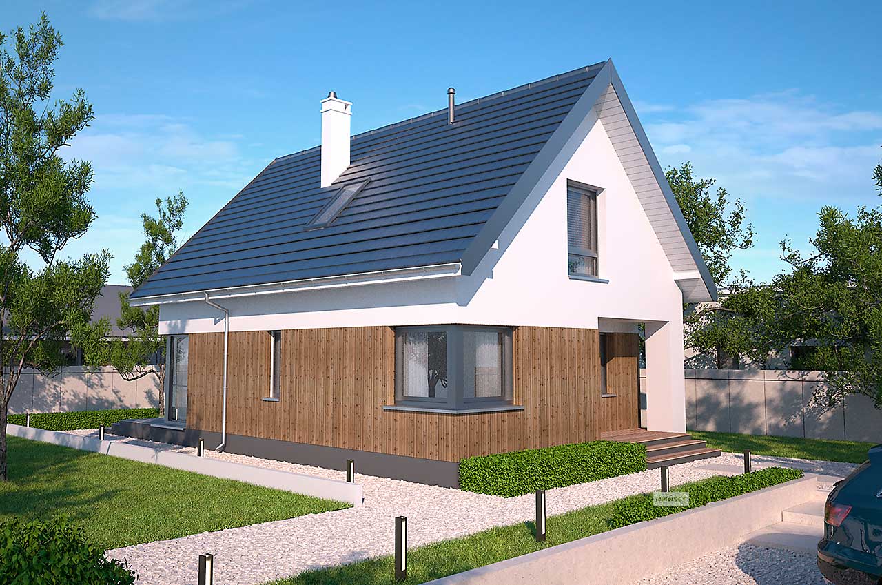 Niewielki, zgrabny dom z użytkowym poddaszem, który dzięki wejściu od szczytu, może być zlokalizowany na niezbyt szerokiej działce. Prosta bryła, której elewację zdobią elementy drewniane, kryje funkcjonalne wnętrze, podzielone na część wspólną na parterze i część prywatną na poddaszu. Na parterze przewidziano oprócz salonu z aneksem kuchennym dodatkowy pokój, a także łazienkę i pomieszczenie gospodarcze z kotłem gazowym. Poddasze zajmują dwie ustawne sypialnie i duża łazienka. Ozdobą domu jest przeszklony narożnik w salonie, będący jednocześnie wyjściem na ciekawie zaaranżowany taras oraz narożne okna w pomieszczeniach na parterze. Uwagę zwraca również wejście, usytuowane w niewielkim podcieniu.