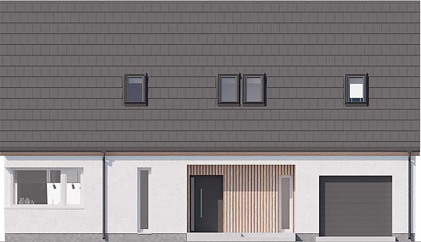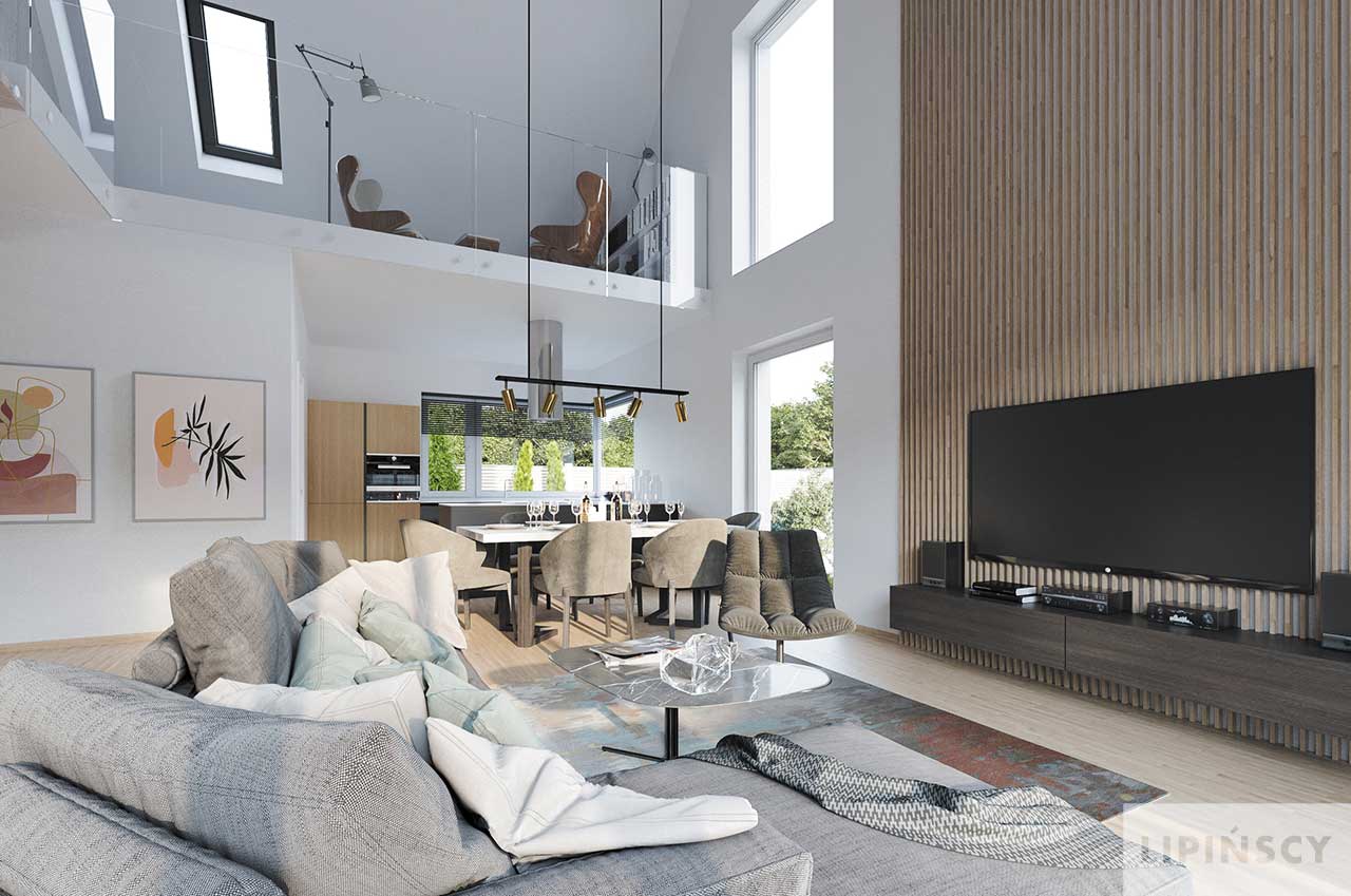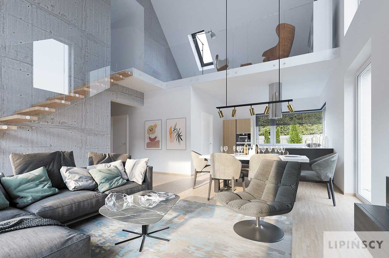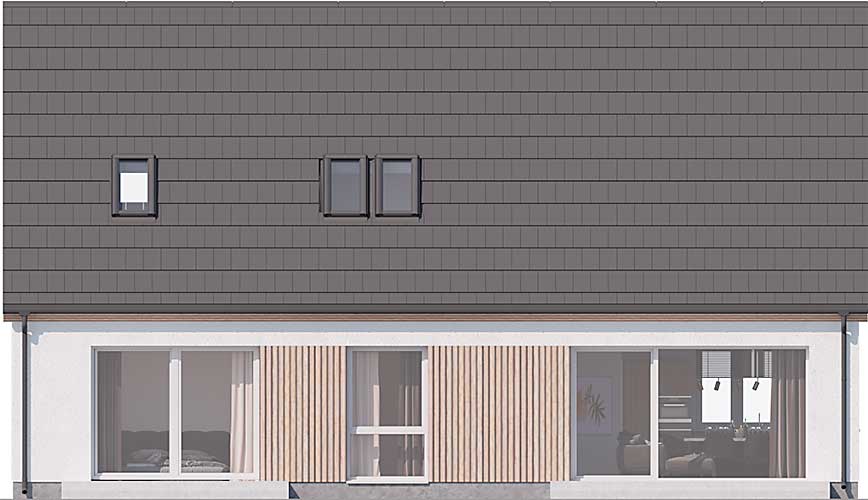 Projekt Valbella to parterowy dom z poddaszem użytkowym na antresoli i dwuspadowym dachem. Oferuje efektowną przestrzeń dzienną z sufitem salonu podwyższonym do dachu i otwartą na salon kuchnią z przejściem do pomieszczenia gospodarczego. Strefa prywatna została podzielona na dwie sypialnie z łazienką na parterze i dwie na poddaszu również z łazienką, a także z otwartą przestrzenią wypoczynkową lub do pracy na antresoli. Jednostanowiskowy garaż jest wbudowany w bryłę budynku pod wspólnym dachem. W projekcie przewidziano ogrzewanie pompą ciepła.