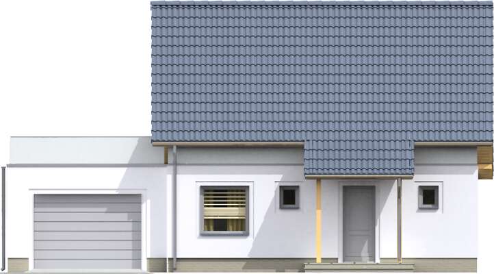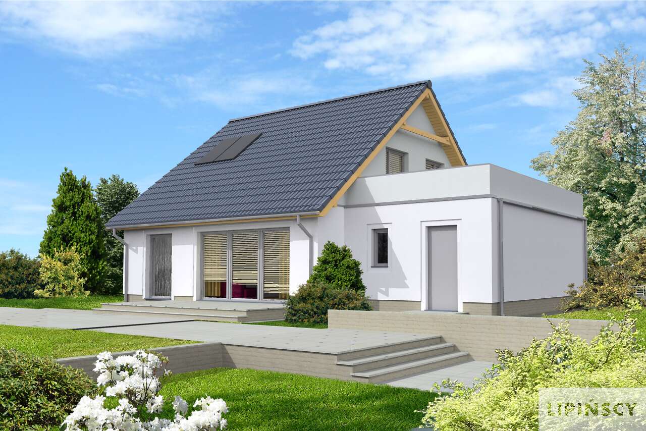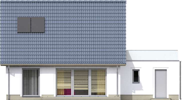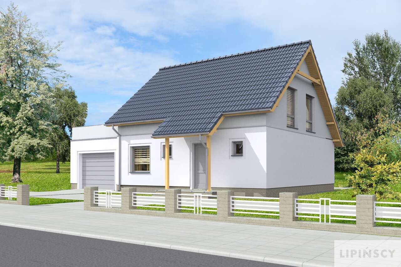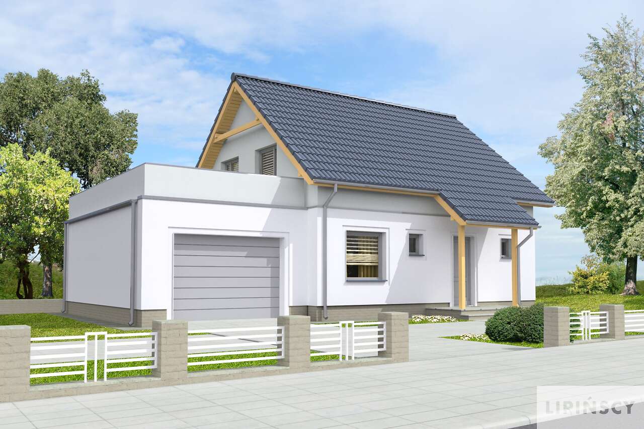Nieduży dom z użytkowym poddaszem, w standardzie pasywnym. Przejrzysty i przemyślany układ funkcjonalny to wielki atut tego projektu, a prosta bryła i dwuspadowy dach korzystnie wpływają na koszty budowy. Na parterze znajduje się salon, z wydzieloną częścią na rodzinny stół. Zamknięta kuchnia ucieszy zwolenników takiego rozwiązania – wyraźnego oddzielenia tego pomieszczenia od salonu. Obok kuchni przewidziano przydatną spiżarnię. Dodatkowy pokój na parterze doskonale sprawdzi się jako gabinet lub pokój gościnny. Poddasze to część prywatna domu, z trzema sypialniami, wygodną łazienką i niedużą pralnią. W projekcie przewidziano garaż na jedno stanowisko, z tarasem na dachu, który – z racji pasywności części mieszkalnej, został wyraźnie wydzielony termicznie od budynku.