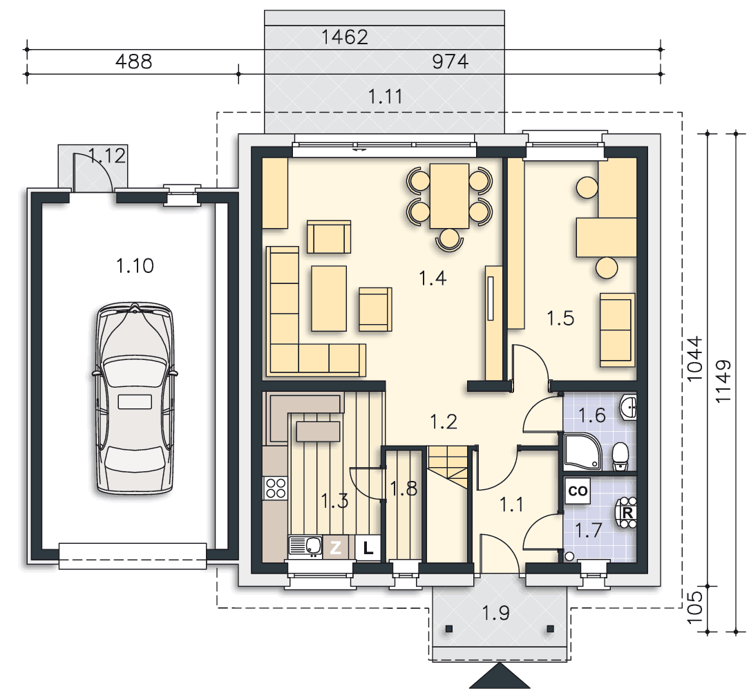 Można przenieść garaż od strony łazienki i gabinetu.