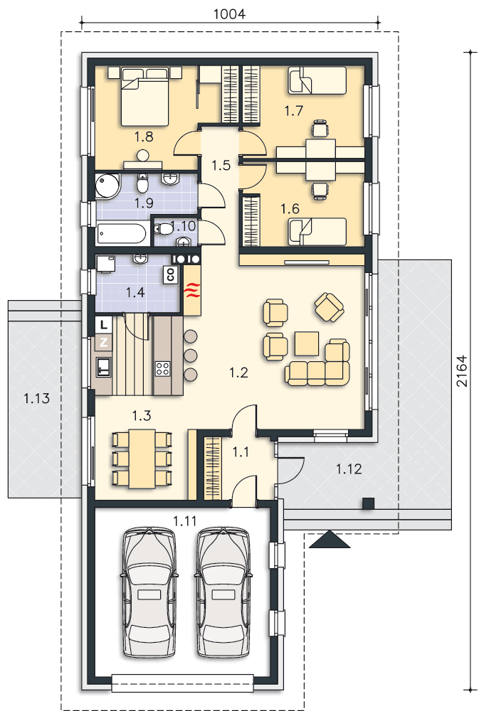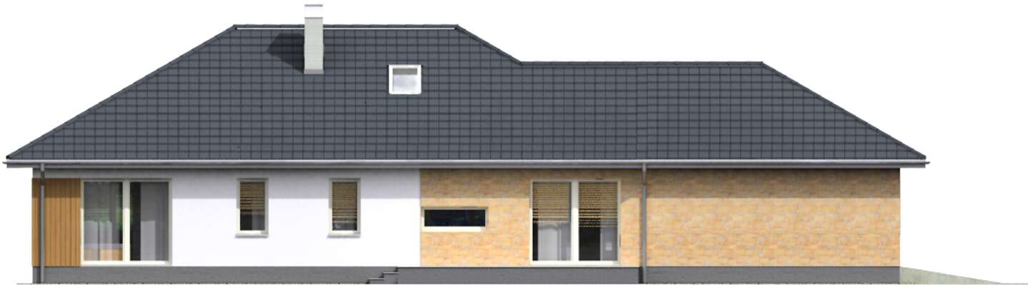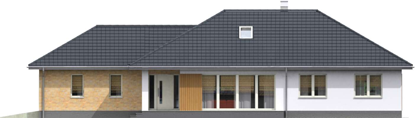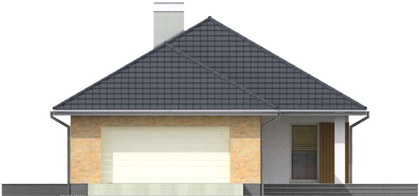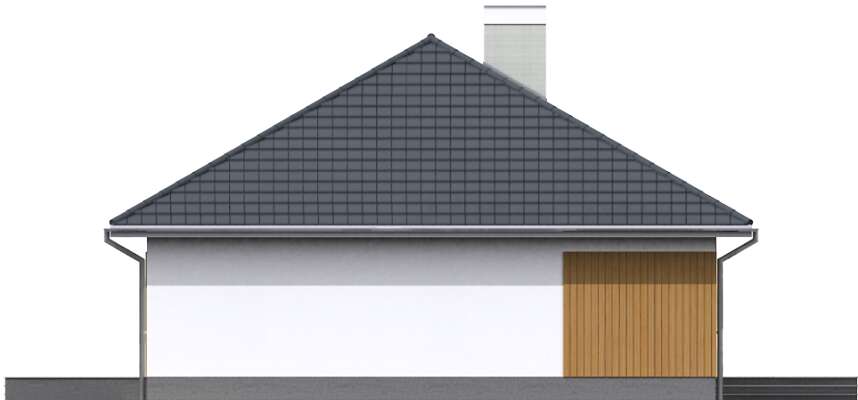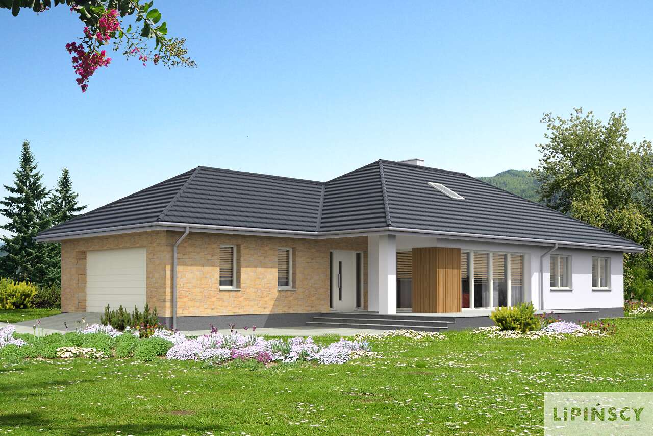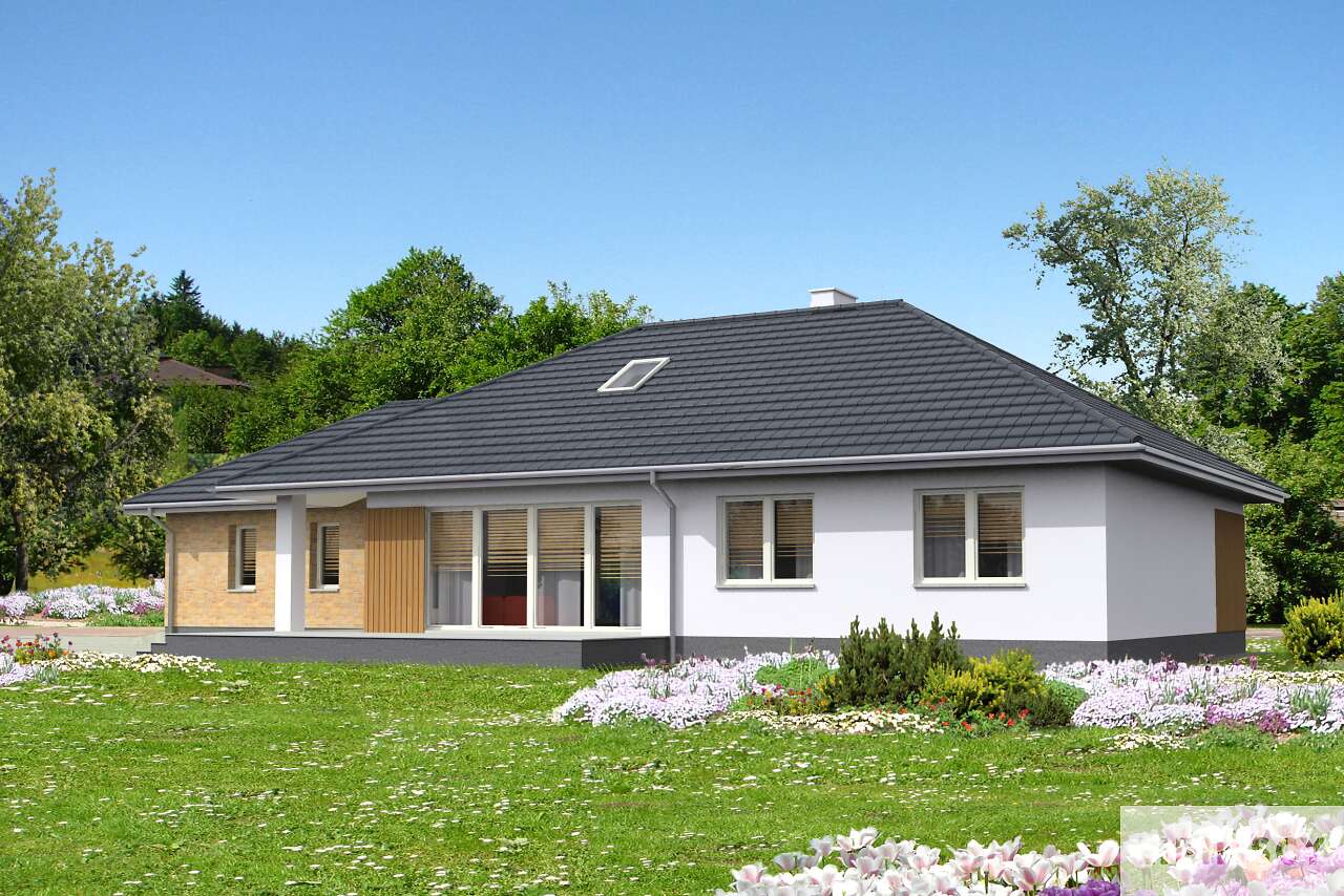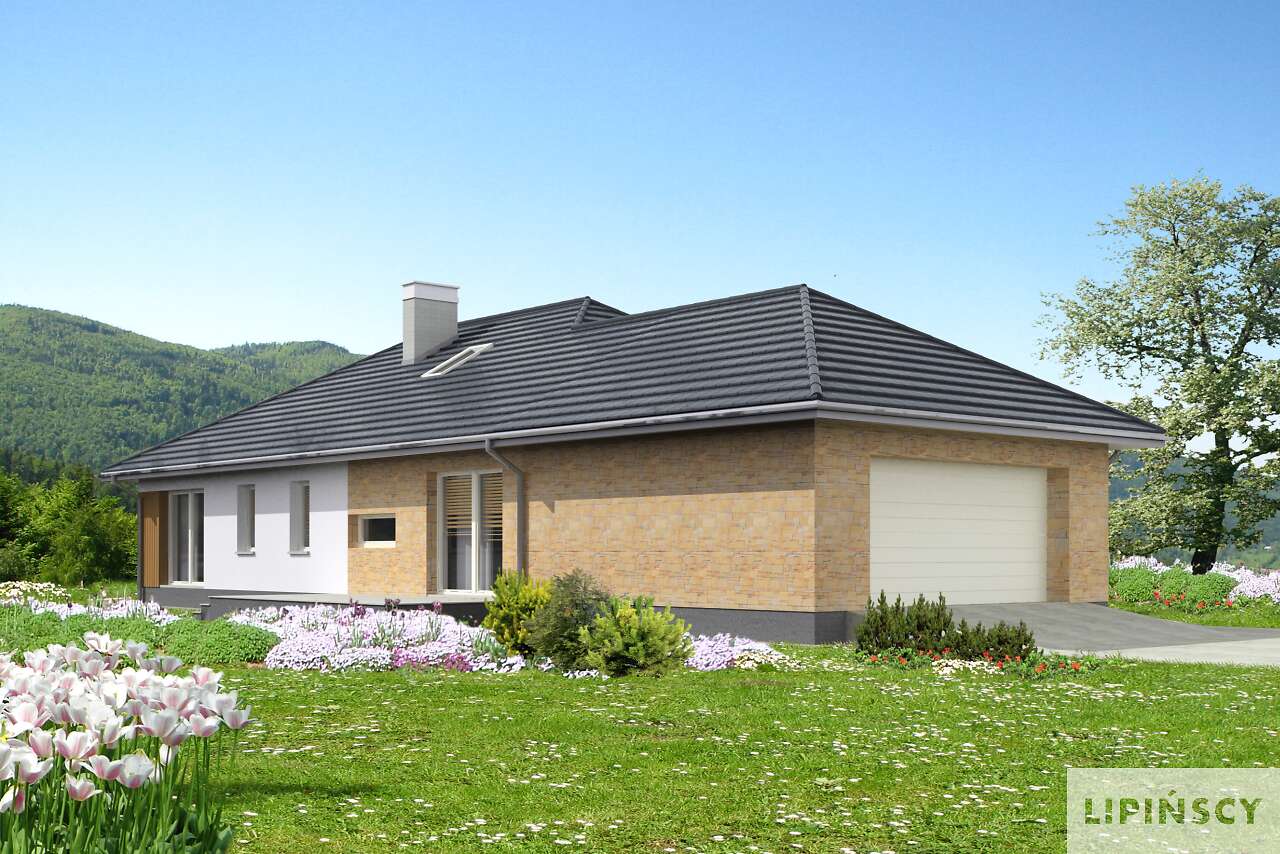 Dom parterowy, energooszczędny, z wkomponowanym garażem na dwa stanowiska, który dzięki szczytowemu usytuowaniu wjazdów, można zmieścić na niezbyt szeroką działkę. Do dyspozycji mieszkańców jest duży salon, otwarta na niego kuchnia z wygodną wyspą, jadalnia przy kuchni oraz trzy wygodne sypialnie, łazienka i toaleta. Przy kuchni zlokalizowano kotłownię z podręczną spiżarnią, która może również być pralnią. Prosta bryła, z klinkierowymi i drewnianymi elementami elewacji jest elegancka i lekka, głównie dzięki zastosowaniu dużych przeszkleń.