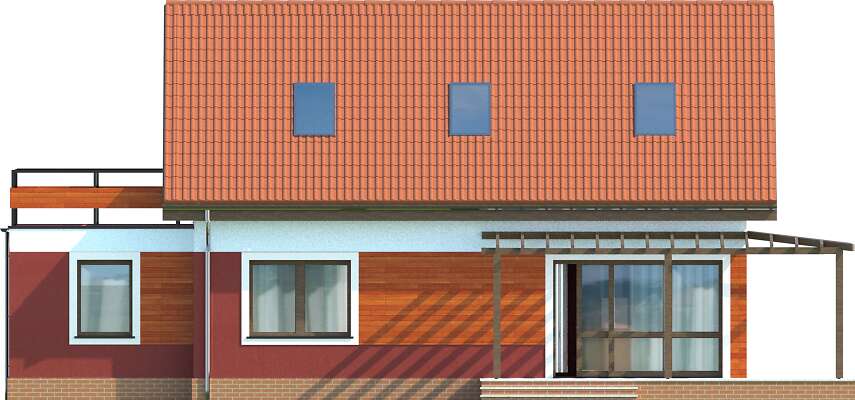 Wygodny, prosty i tani w realizacji dom z użytkowym poddaszem. Funkcjonalność została zapewniona poprzez doskonałe rozplanowanie przestrzeni. Salon połączonym z kuchnią, z centralnie umieszczonym kominkiem pełni funkcję reprezentacyjną. Dodatkowy pokój z łazienką w odosobnionym miejscu za schodami zapewni trochę intymności, czy to rodzicom, czy też odwiedzającym gościom. Z kotłowni zaplanowano wygodne przejście do garażu. Poddasze to dwie duże sypialnie, z których każda ma własną garderobę, a jedna dodatkowo własny taras oraz ustawna łazienka. Takie rozplanowanie strefy prywatnej zapewnia mieszkańcom pełną wygodę.