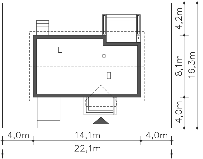 Grafika przedstawia minimalne wymiary działki. Aby sprawdzić, czy dom może być realizowany na konkretnej działce należy uzyskać Wypis i Wyrys z Miejscowego Planu Zagospodarowania Przestrzennego lub jeśli na danym terenie nie ma planu – Decyzję o warunkach zabudowy. Wszystkie projekty wymagają adaptacji do warunków miejscowych przez projektanta lokalnego.