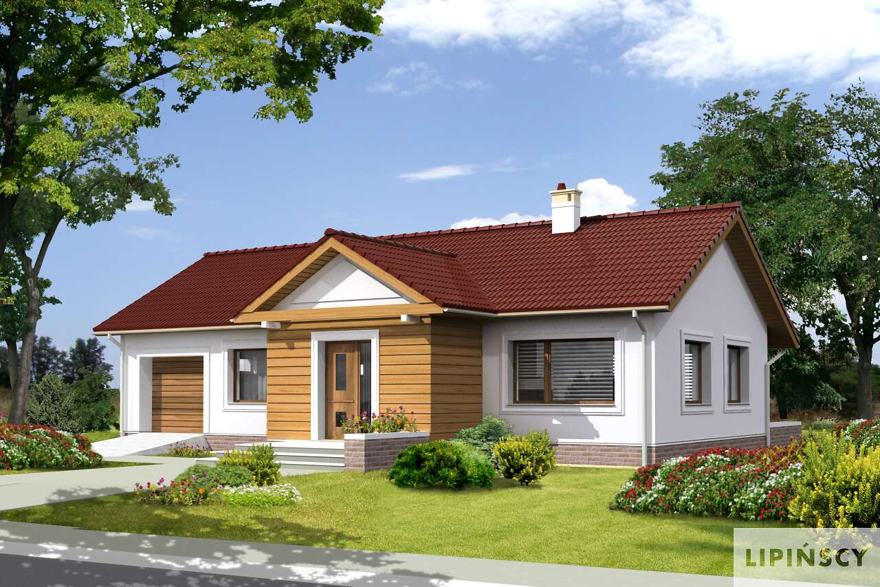 Ładny wygląd tego domu to zasługa dobrze dobranych proporcji, ciepłej kolorystyki i detali, takich jak opaski okienne i drewniane okładziny. Wnętrze to nowoczesny układ pomieszczeń, gdzie część dzienna skupia się wokół umieszczonego centralnie kominka. Do kuchni można wejść bezpośrednio z holu. Wiatrołap natomiast jest wyposażony o małe pomieszczenie gospodarcze, mogące pełnić rolę garderoby. Dom będzie doskonale pasował na działki z wjazdem od zachodu.