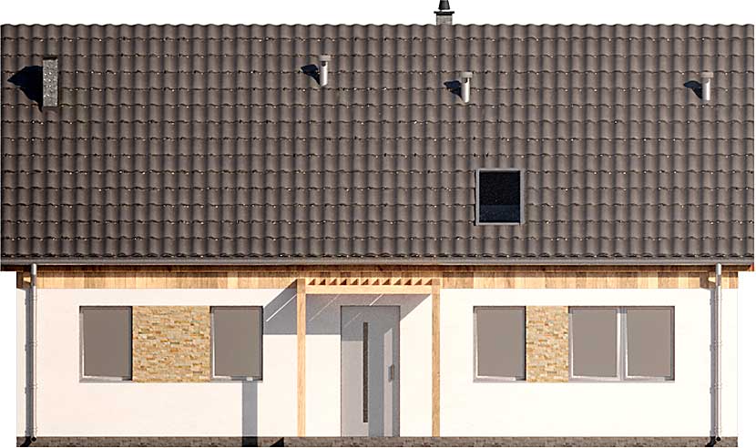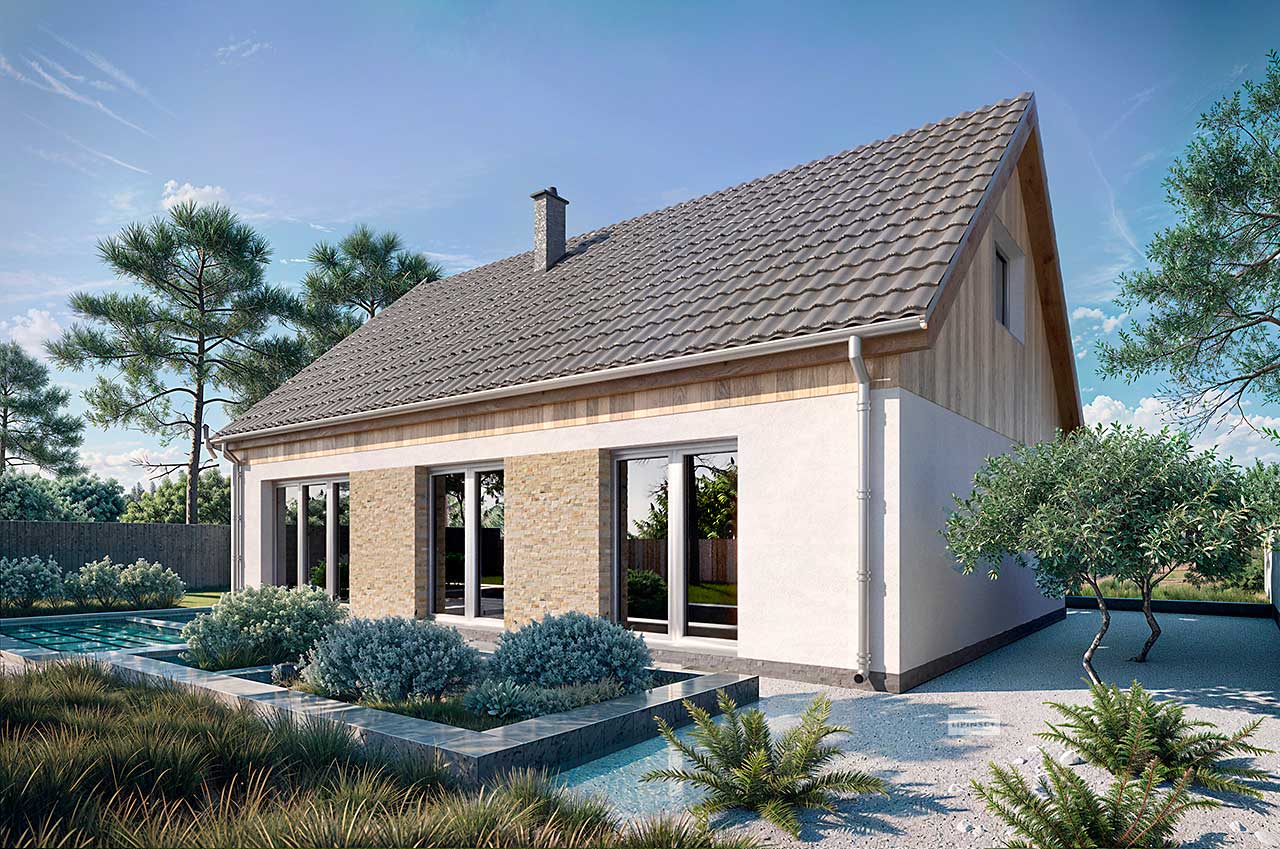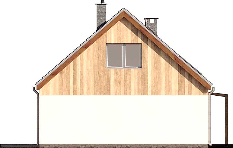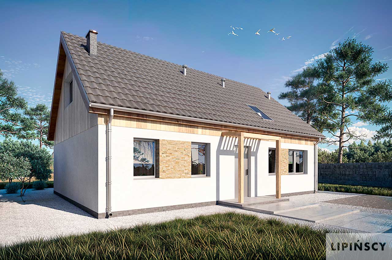 Vitez to projekt niewielkiego parterowego domu ze strychem do adaptacji. Schody na górę umieszczone są tuż przy wejściu w wiatrołapie, co pozwala wydzielić na górze niezależną przestrzeń. Funkcja parteru może zaspokoić potrzeby 3 osobowej rodziny, posiadając 2 sypialnie, w tym jedną z wnęką na garderobę. Do dyspozycji jest też duża łazienka z wanną i prysznicem, wydzielone pomieszczenie gospodarcze, gdzie zlokalizowany jest piecyk gazowy oraz pralka. Strefa dzienna wyznaczona w przeciwległej części domu, łączy salon z jadalnią i kuchnią. Pod schodami mamy też trochę miejsca na spiżarkę dostępną bezpośrednio z kuchni. Wszystkie pokoje mają wyjścia ogrodowe. W salonie strefę dzienną z ogrodem łączy potrójne okno tarasowe, natomiast całość doświetlona jest aż z trzech stron. Niewielka powierzchnia domu, dwuspadowy dach i bryła na planie prostokąta zapewniają niskie koszty budowy.