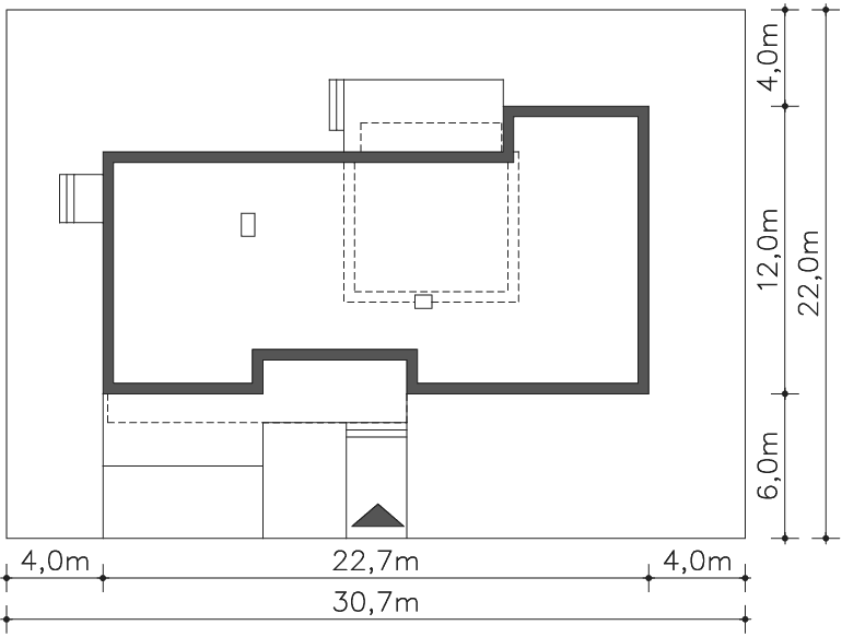 Grafika przedstawia minimalne wymiary działki. Aby sprawdzić, czy dom może być realizowany na konkretnej działce należy uzyskać Wypis i Wyrys z Miejscowego Planu Zagospodarowania Przestrzennego lub jeśli na danym terenie nie ma planu – Decyzję o warunkach zabudowy. Wszystkie projekty wymagają adaptacji do warunków miejscowych przez projektanta lokalnego.