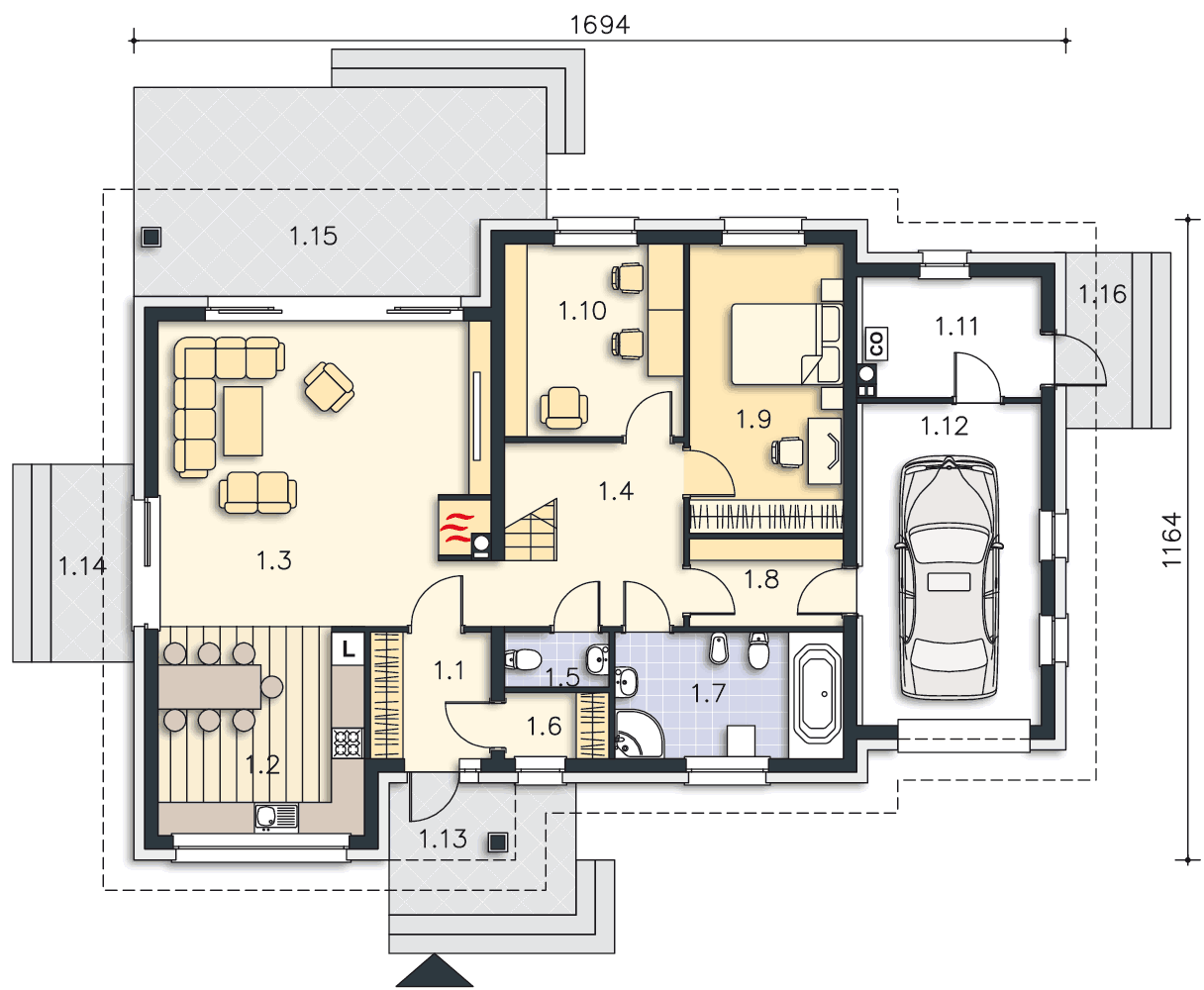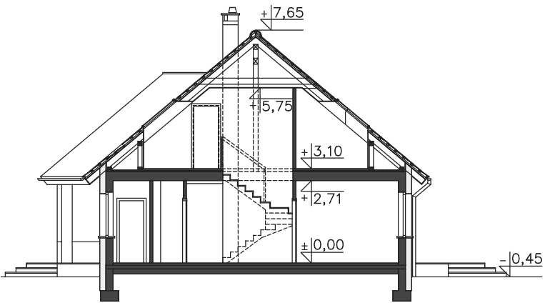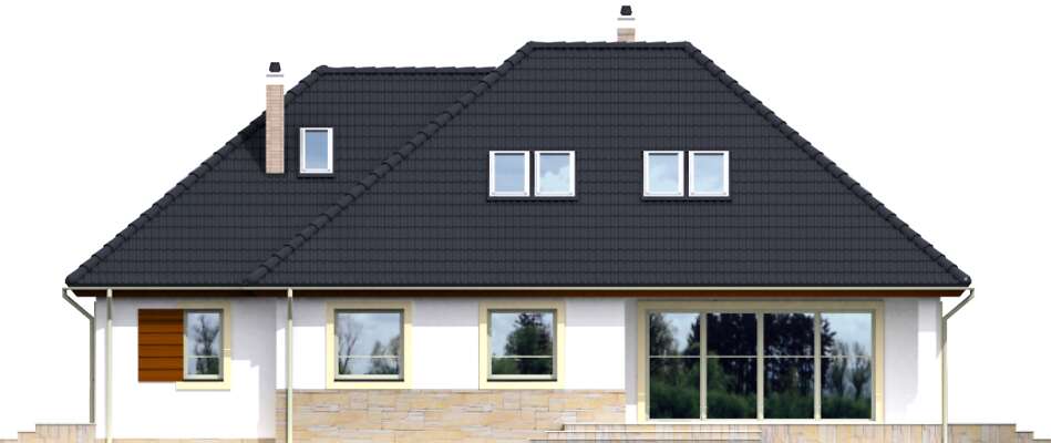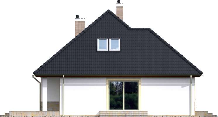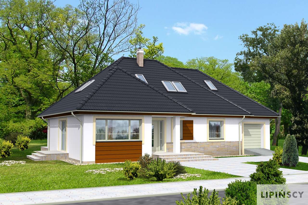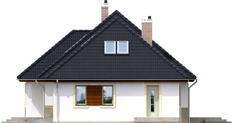 Dom energooszczędny, z użytkowym poddaszem, dla większej rodziny lub małżeństwa z dojeżdżającymi dziećmi. Na parterze znajduje się część wspólna - salon z dużymi oknami i przeszklonym wyjściem na taras, kuchnia z wydzieloną częścią jadalną oraz wc, i część prywatna z sypialnią, gabinetem i wygodną łazienką. Poddasze stanowi kontynuację strefy nocnej. Są tu dwie sypialnie, łazienka i garderoba. W bryłę budynku wkomponowano garaż na jedno auto. Uwagę zwraca ciekawie zaaranżowane wejście.