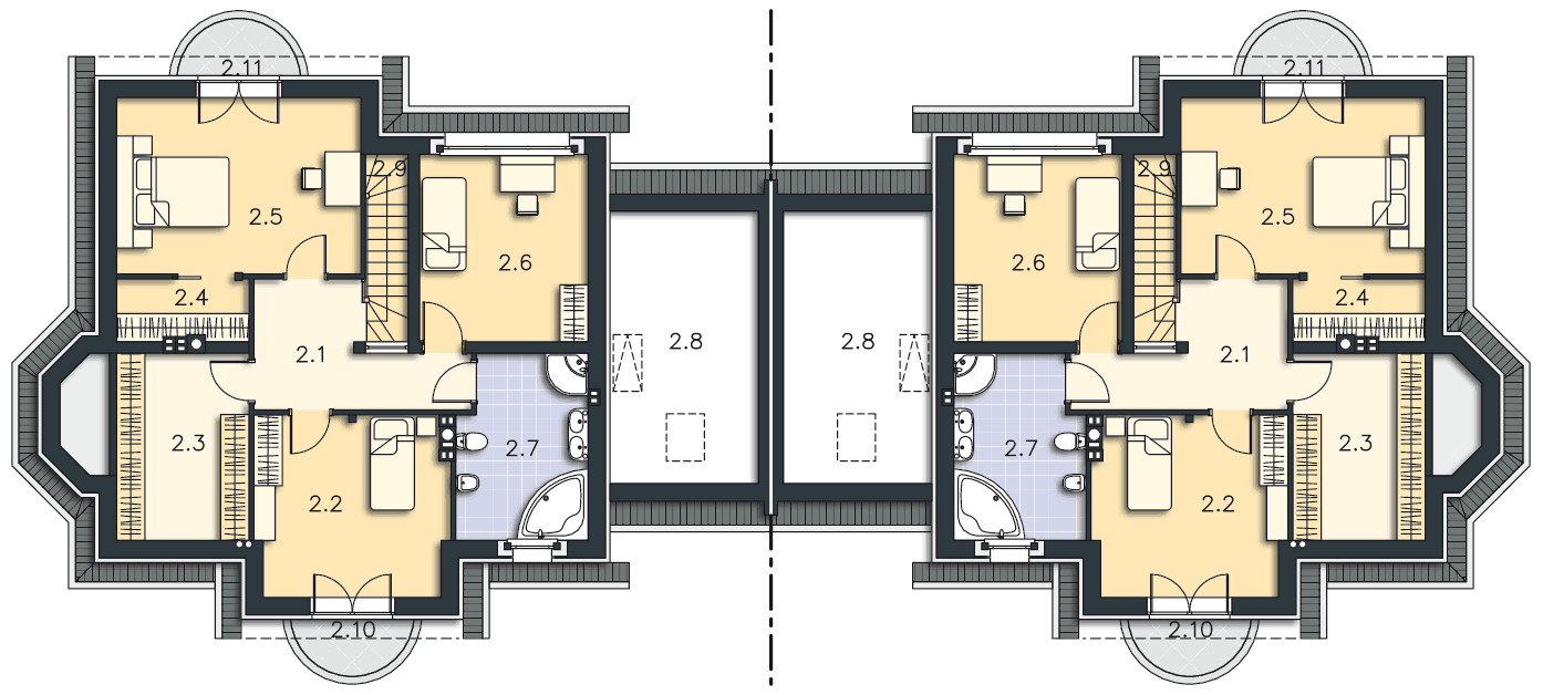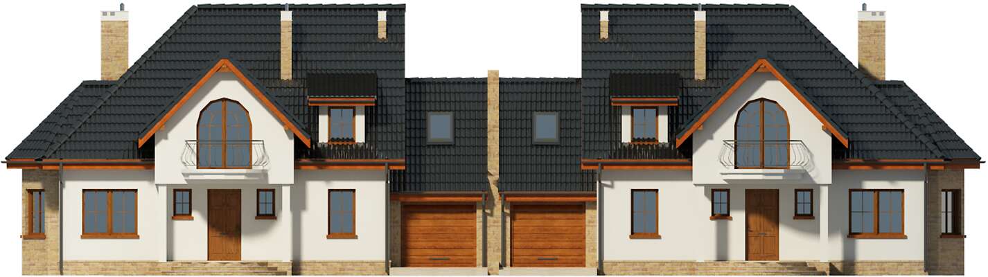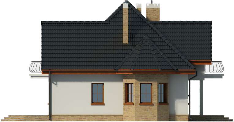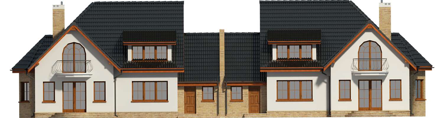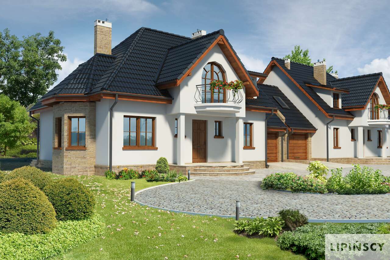 Urokliwy bliźniak o doskonałym układzie, nawiązujący bryłą i detalem architektonicznym do lubianej zabudowy dworkowej. Z zadaszonego ganku wchodzi się do przestronnego wiatrołapu, z którego jest przejście do reprezentacyjnego salonu z kominkiem. W funkcjonalnej kuchni znajduje się ozdobny wykusz jadalni. Wygodna sypialnia na parterze ma bezpośredni dostęp do własnej łazienki. Na poddaszu są trzy przestronne sypialnie, pokój kąpielowy i pomieszczenie gospodarcze. Dostępna jest wersja bez garażu Wellington (LMBL12).