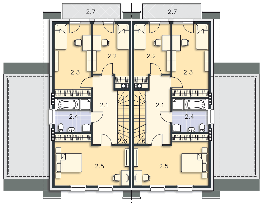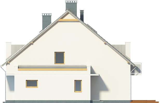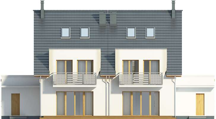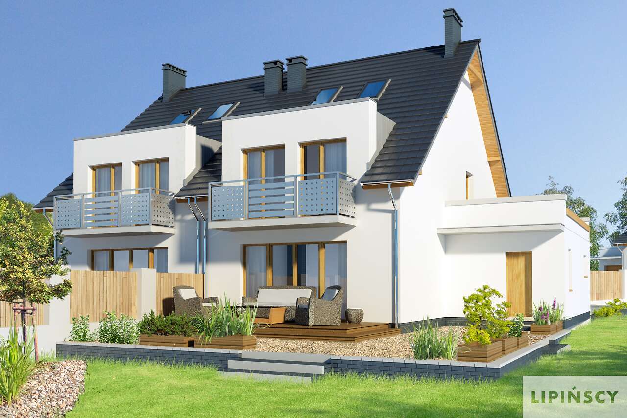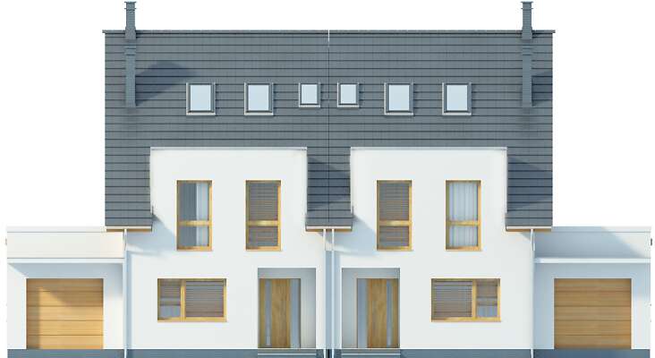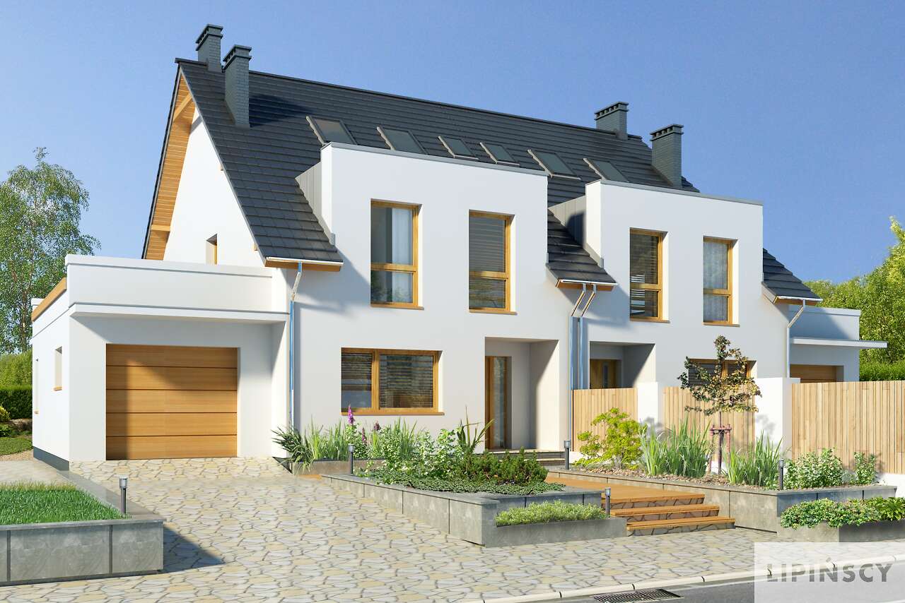 Dom w zabudowie bliźniaczej o prostej bryle, z nowoczesnymi prostokątnymi lukarnami, dzięki którym na poddaszu uzyskano więcej przestrzeni użytkowej. Każdy segment mieści część wspólną na parterze oraz część prywatną na poddaszu. W części dziennej mamy więc wiatrołap, zamkniętą kuchnię ze spiżarnią, duży salon i łazienkę z prysznicem. Poddasze podzielono na 3 pokoje i wygodną łazienkę z oknem. Za jednostanowiskowym garażem znajduje się kotłownia z osobnym wyjściem na zewnątrz.