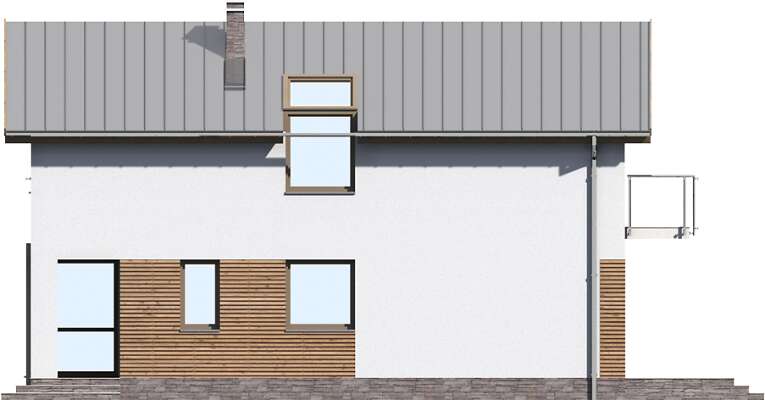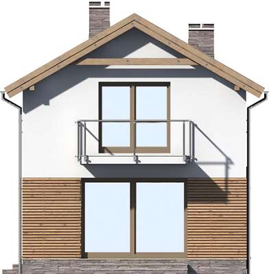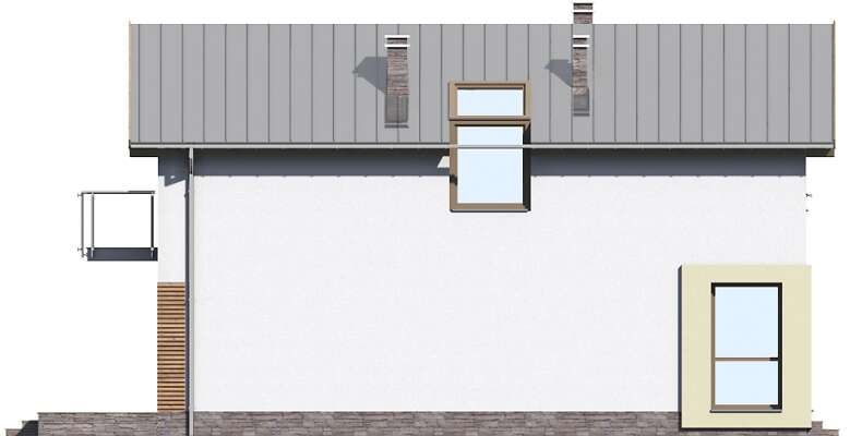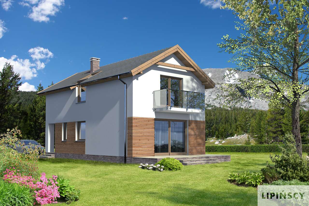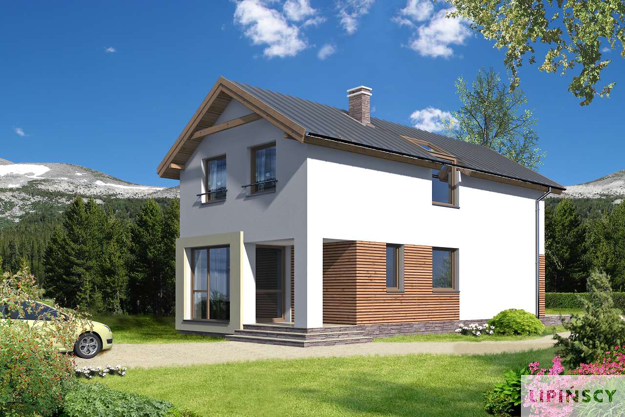 Ciekawy dom z użytkowym poddaszem, doskonały na wąską działkę. Na parterze, w części wspólnej, dziennej, przewidziano salon z kominkiem i pięknym dużym oknem, będącym jednocześnie wyjściem na taras, otwartą na salon kuchnię z miejscem na rodzinny stół, wc, pomieszczenie gospodarcze i kotłownię. Poddasze to część wyraźnie nocna, gdzie zaprojektowano trzy sypialnie, w tym jedną z własną garderobą i wyjściem na balkon oraz wygodną, dużą łazienkę.