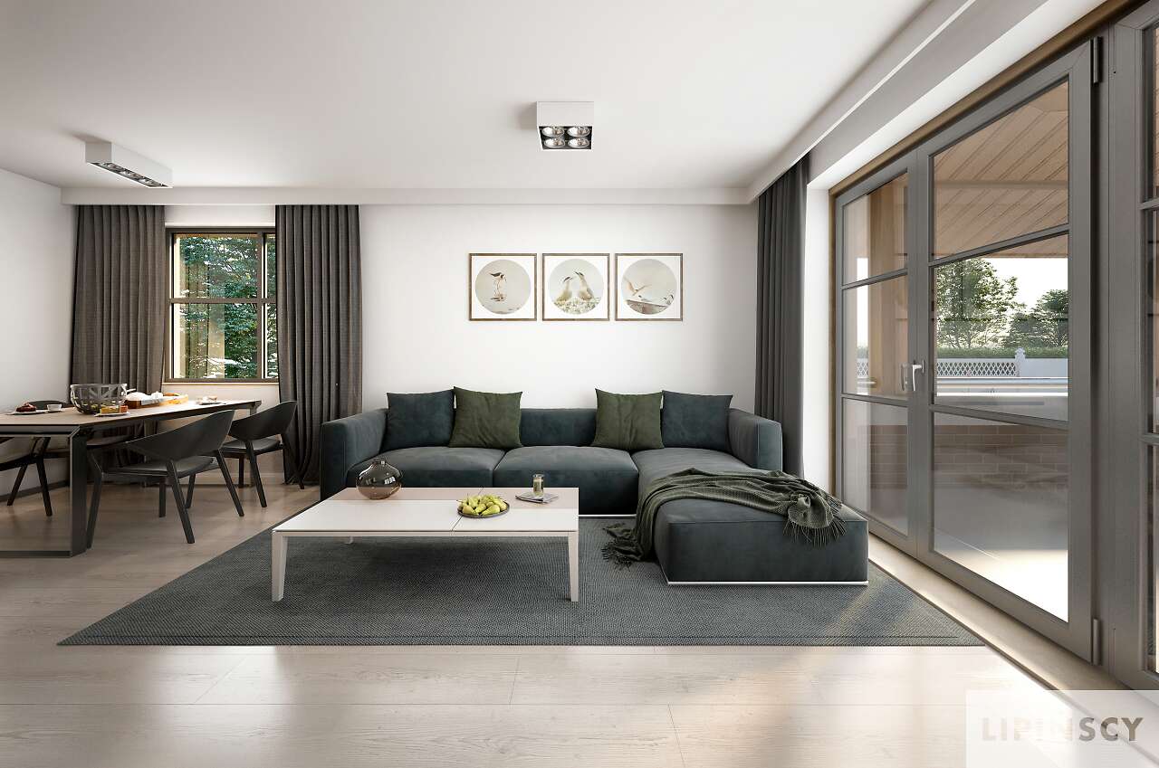 Wybrany projekt budowlany zachwyca prostotą budowy oraz rzadko spotykaną funkcjonalnością. Ważnym argumentem jest także pięknie zadaszone i uwidocznione wyjście na taras. Projekt wyróżnia prostota w budowie oraz koszta (niskie)
