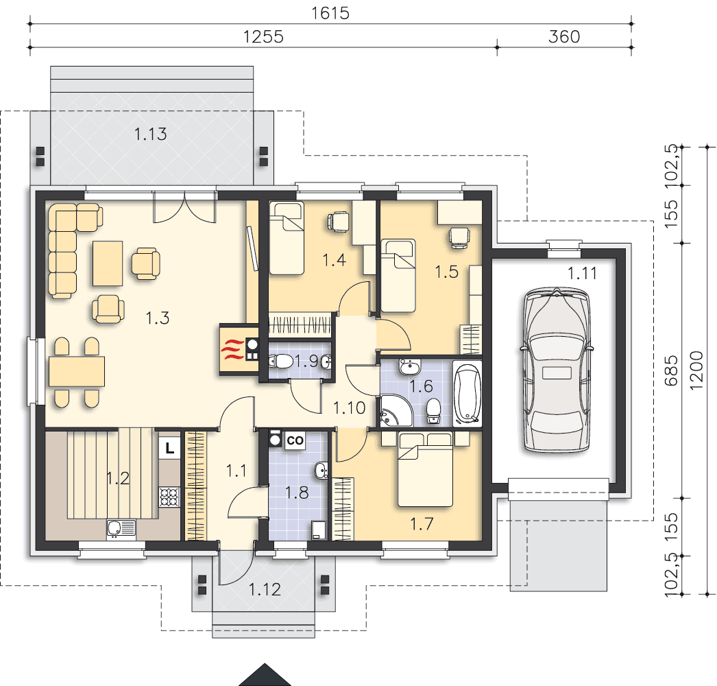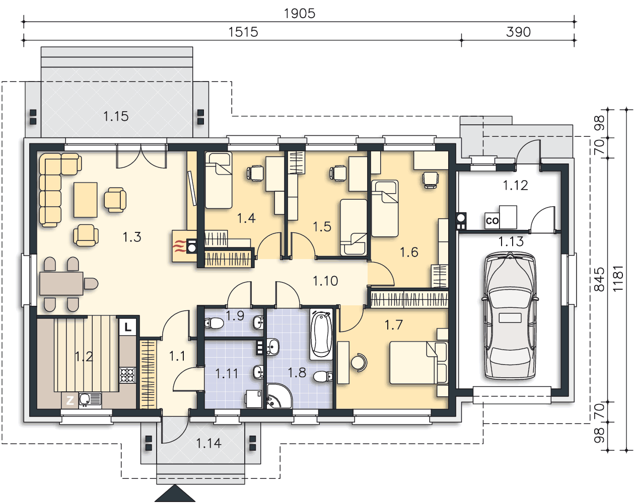 Projekt przewiduje ogrzewanie gazowe. Pomieszczenie kotłowni może okazać się za wąskie na umieszczenie pieca na paliwo stałe. Wszystko zależy od wybranego rodzaju i producenta pieca, który podaje minimalne odległości, które trzeba zapewnić do prawidłowej obsługi i konserwacji urządzenia.