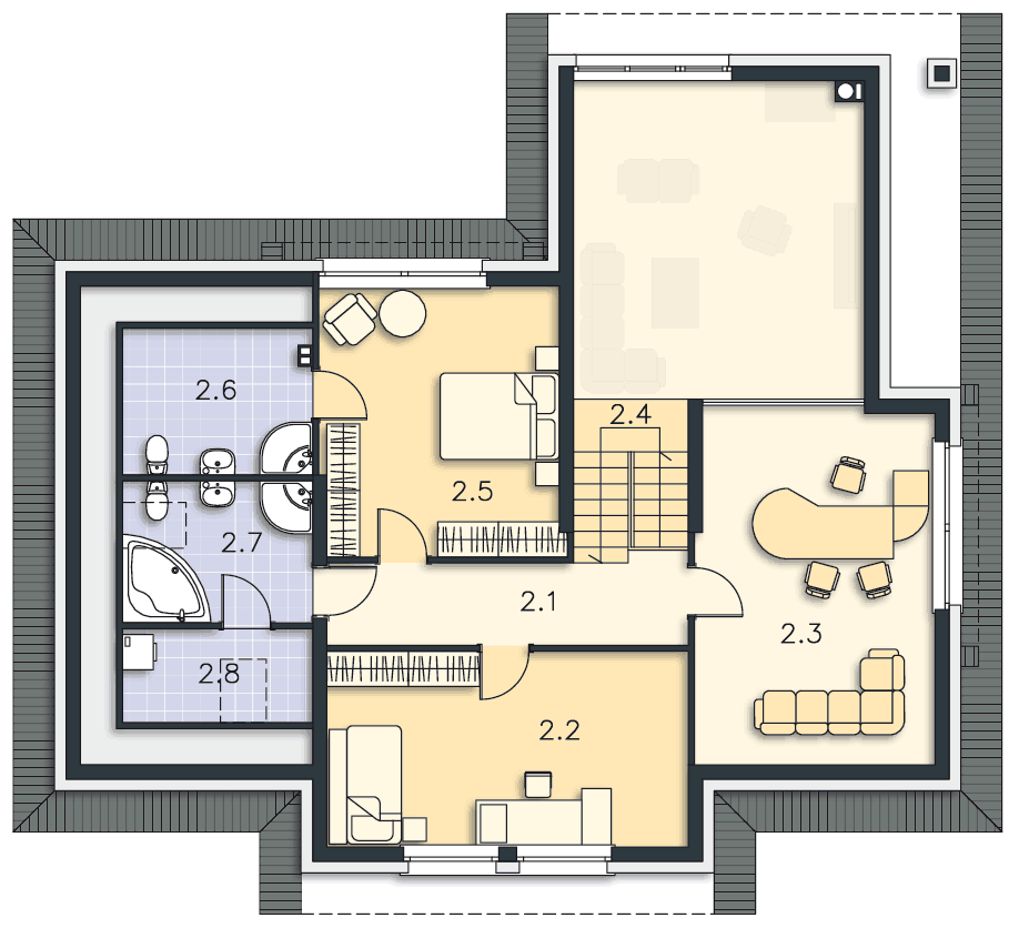 Bardzo interesujący projekt. Podoba mi się ilość światła w pomieszczeniach jednak zastanawiam się czy można dodatkowo umieścić okno dachowe w pomieszczeniu 2.3?