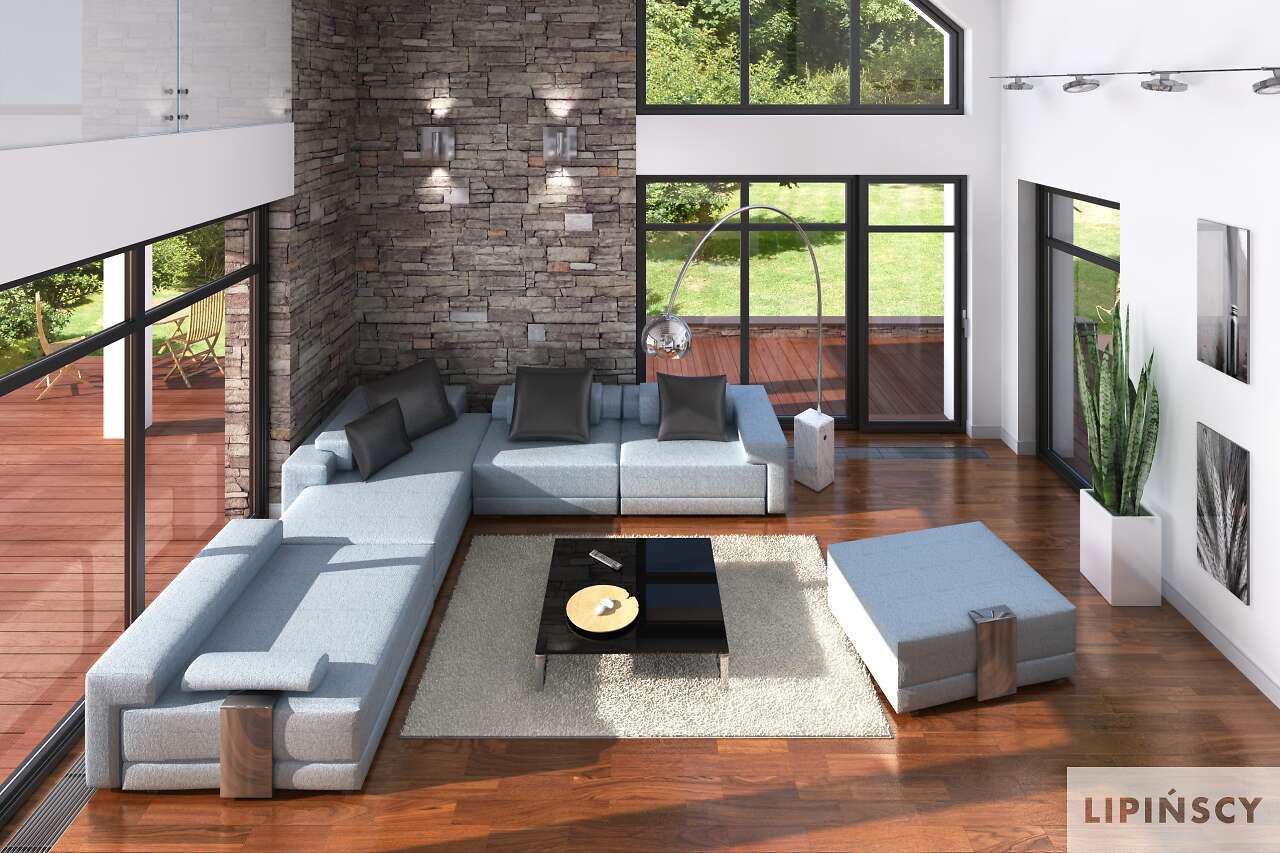 Na razie mamy wizualizacje do wersji podstawowej Avalon DCP 206, który ma nieco inne wymiary, ale podobną estetykę. Można tam zobaczyć proponowaną aranżację pozwalającą podkreślić przestrzeń w tym domu.