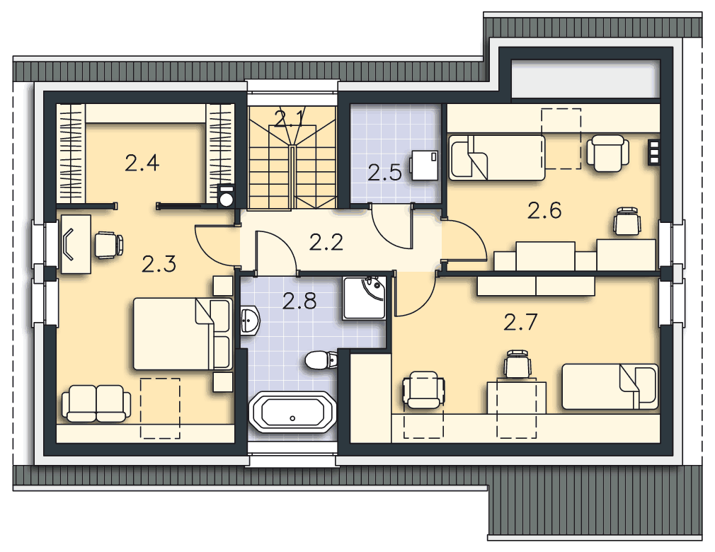 Witam, bardzo podoba mi się rozkład pomieszczeń na poddaszu w tym projekcie :) Są schowki, spora łazienka czyli wszystko jak należy :) Troszkę brakuję mi miejsca na "szybkie śniadanie" gdyż stół jadalniany jest dość daleko od kuchni, ale ten problem łatwo rozwiązać np. blatem a'la bar :)