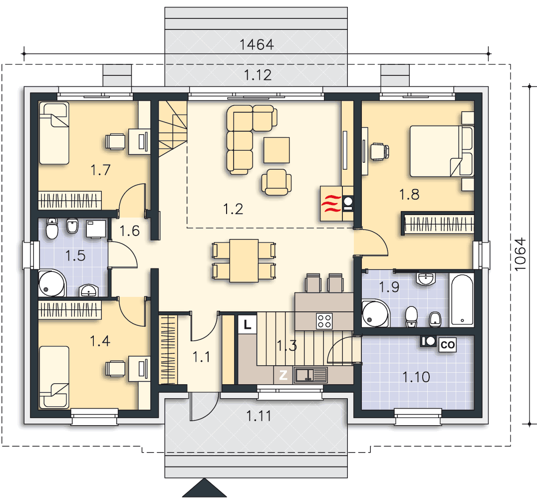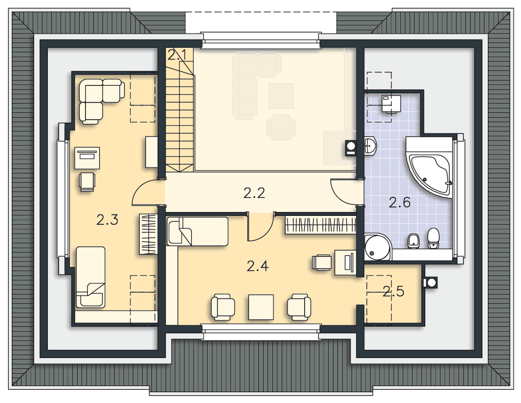 4. Wkradł się niestety błąd na rzucie i tych schodów nie powinno na nim być. Ten projekt nie ma dostępnego strychu. Wiązary są tak ułożone, że uniemożliwiają korzystanie z niego.