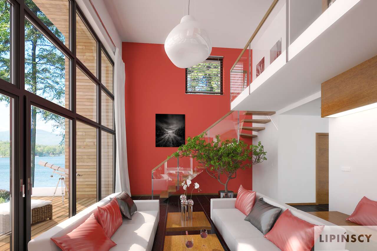 Grzejniki w salonie przewidziane są na ścianach po obu stronach przeszklonej elewacji.