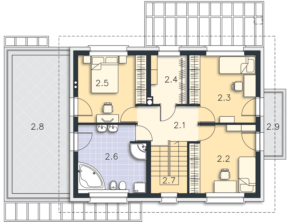 Bardzo mi się podoba ten domek. Dobre rozmieszczenie pokoi. Podoba mi się taras nad garażem.