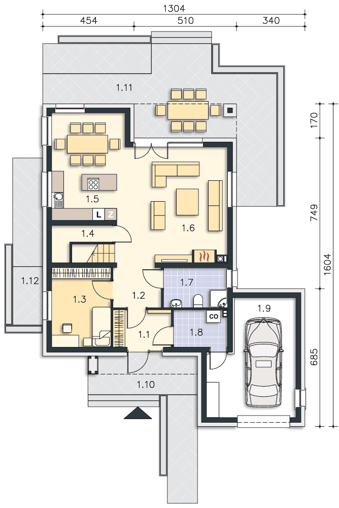 W przypadku, jeśli Pana działka ma wjazd od zachodu, to ten dom będzie nieco mniej korzystnie usytuowany niż w przypadku wjazdu od północy, ale też będzie dobrze się sprawdzał - kuchnia będzie od północy, boczne okno w salonie wyjdzie na południe, a przy wydłużeniu salonu będzie można je dodatkowo poszerzyć.