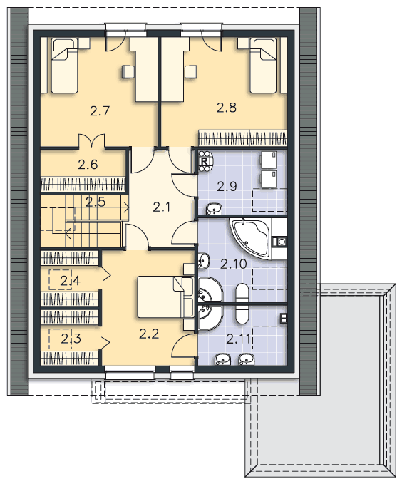 Ten projekt jest kwintesencją powiedzenia, że "piękno tkwi w prostocie", ale oczywiście można go dopasować do własnych wyobrażeń. Najprostsze będą zmiany w zakresie stolarki okiennej. Wysunięte okno w dachu to lukarna. Można by wprowadzić lukarny w sypialniach 2.7, 2.8 od wschodu i zachodu. Podnoszenie ścianki kolankowej ze zmianą kąta nachylenia dachu najbardziej wpłynie na ostateczny wygląd domu i jest najbardziej kosztowną zmianą w projekcie.