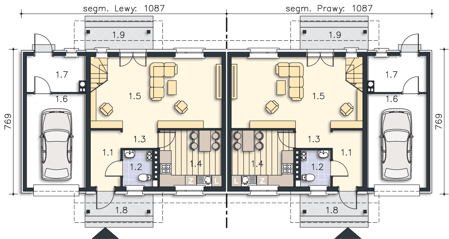 Z tym, że ława fundamentowa jest są pod garażem (zamiast wiaty), a dom dodatkowo poszerzony o 1m.