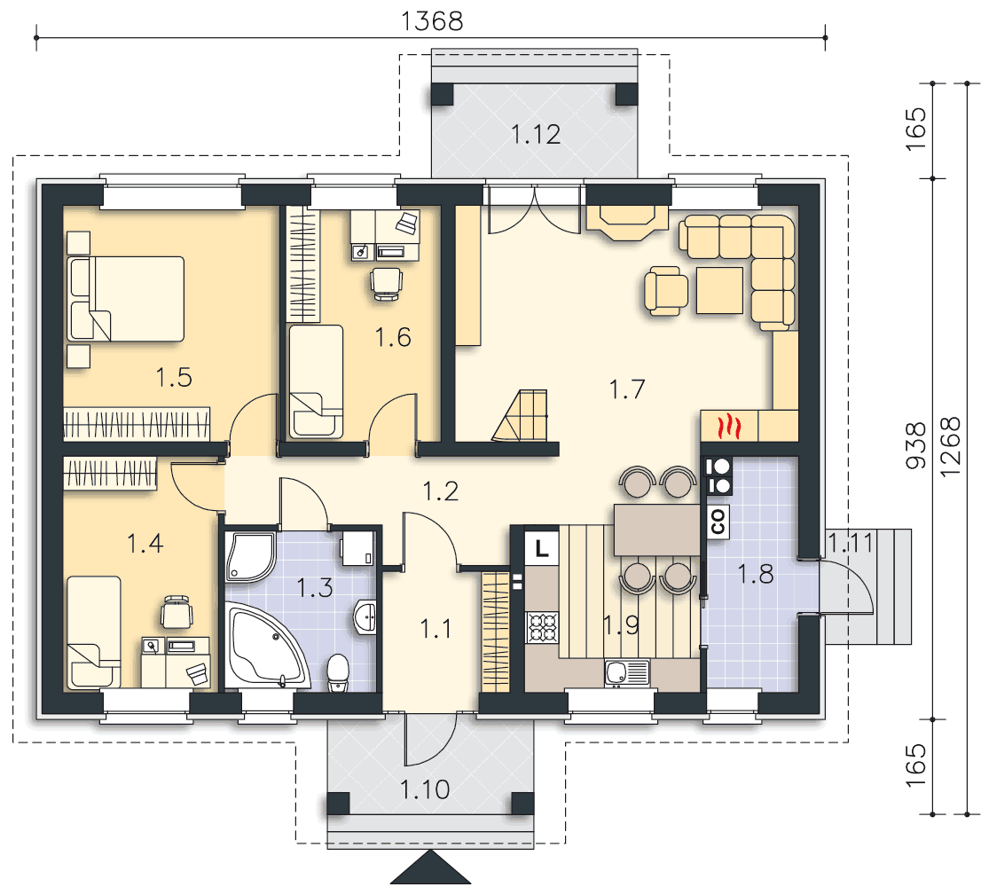 Jeżeli poddasze miałoby być wykorzystywane sporadycznie, to strome schody zmieściłyby się w wiatrołapie. Trzeba wówczas będą one widoczne także w korytarzu 1.2. Jeśli natomiast poddasze miałoby być wykorzystywane często, to warto by rozważyć nieco wygodniejsze schody, a wówczas trzeba będzie wygospodarować na nie nieco więcej miejsca przeprojektowując pomieszczenia 1.3 i 1.4.
