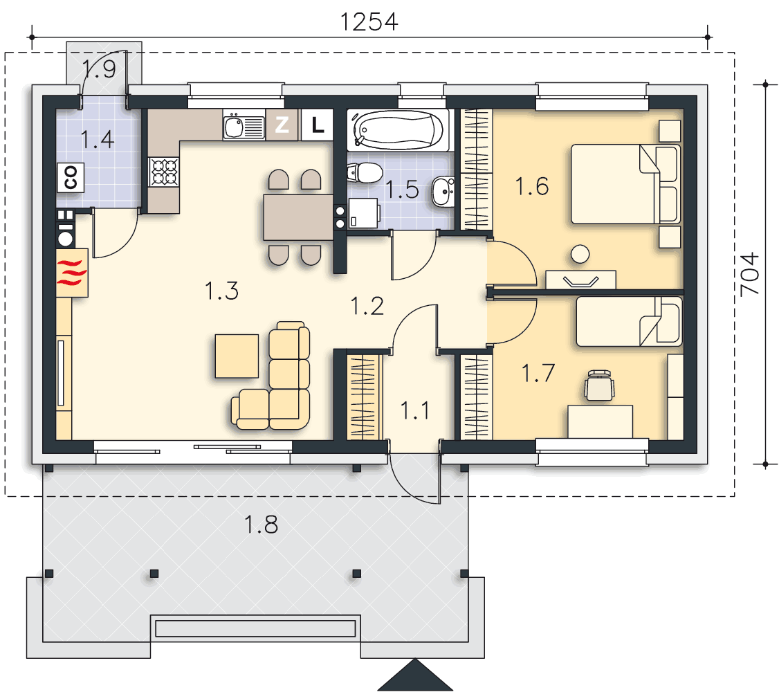 1. Poszerzyć dom o jeden bloczek z 7,04 do 7,63m /zgromadzenie 4 drzwi na 2m2 w/g b. ciasno/, z tego też powodu drzwi wejściowe przesunąć w lewo a szafę w wiatrołapie przenieść na przeciwną stronę
