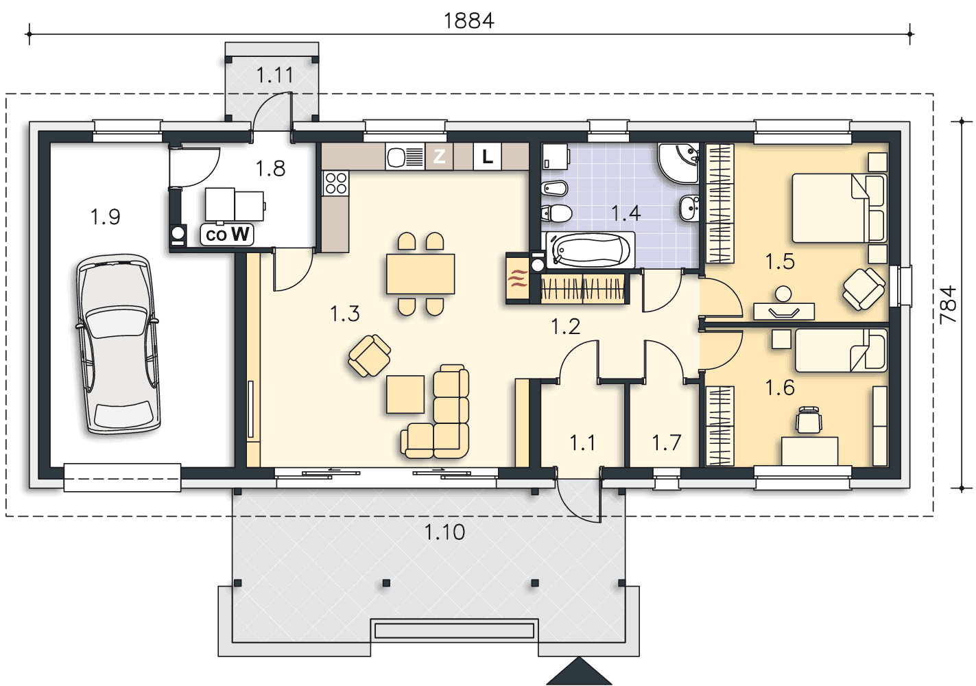 Bardzo mi odpowiada ten projekt. Wejście ma być od południa. Mam problem z garażem. Potrzebuję nieco większy czyli dłuższy i szerszy niż normalnie. Kocioł ustawiłbym w w wydzielonym pomieszczeniu z garażu. Chciałbym aby tam znalazła się umywalka i WC.