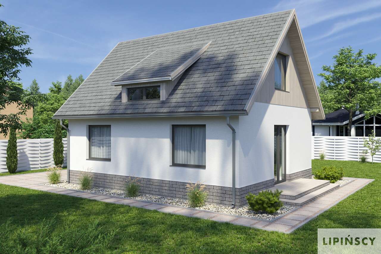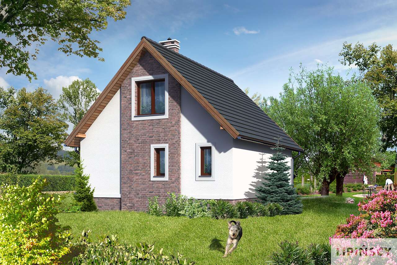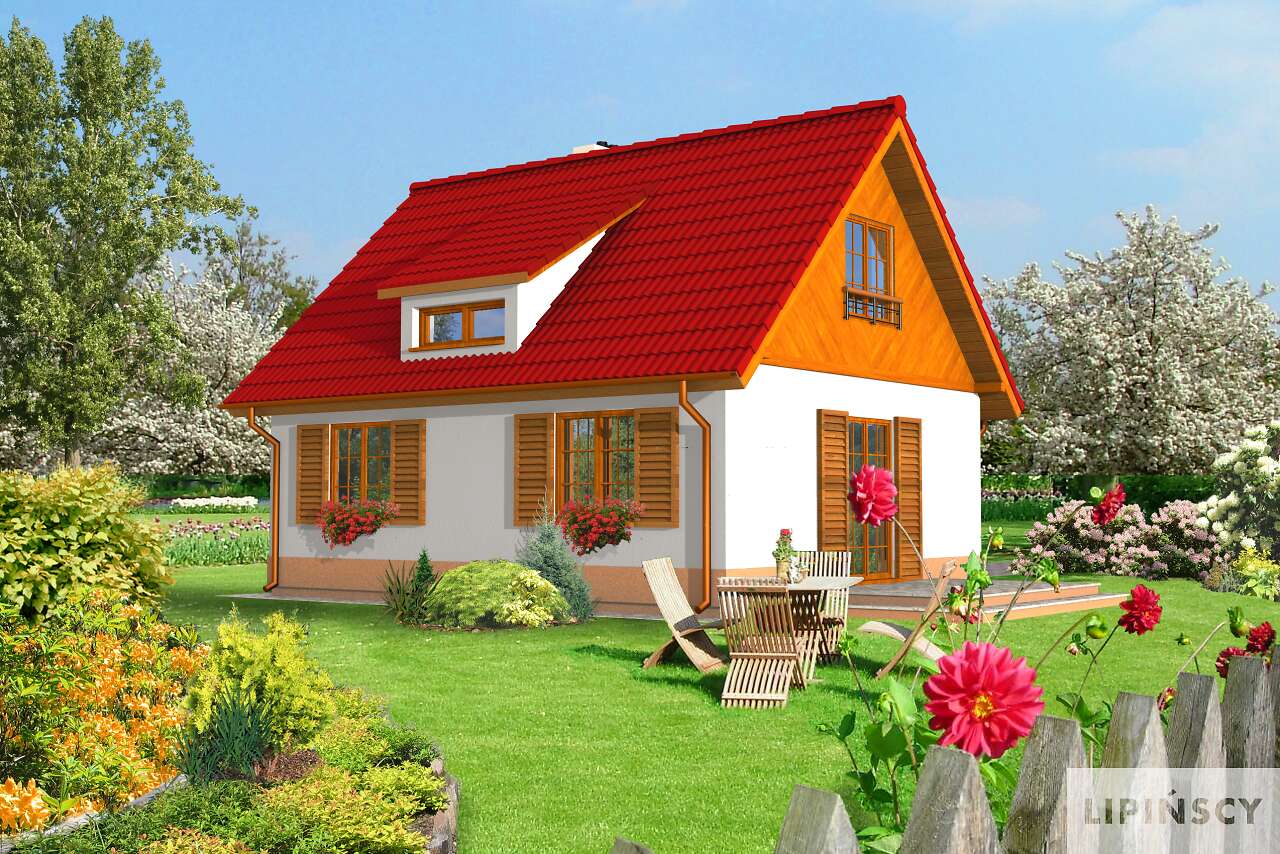 Idealny dla mnie: dach dwuspadowy, salon, kuchnia, łazienka i mały pokój na parterze i dwa pokoje na piętrze. Niewielki i przytulny. Cudo.