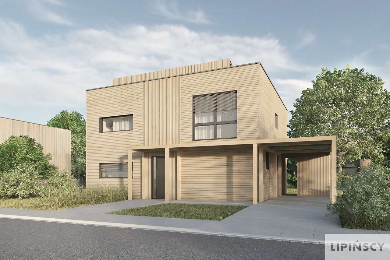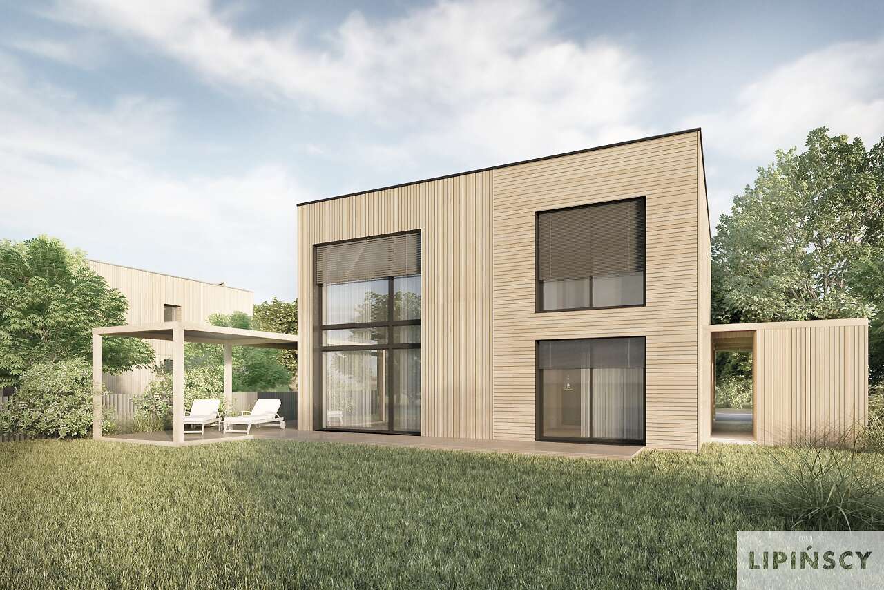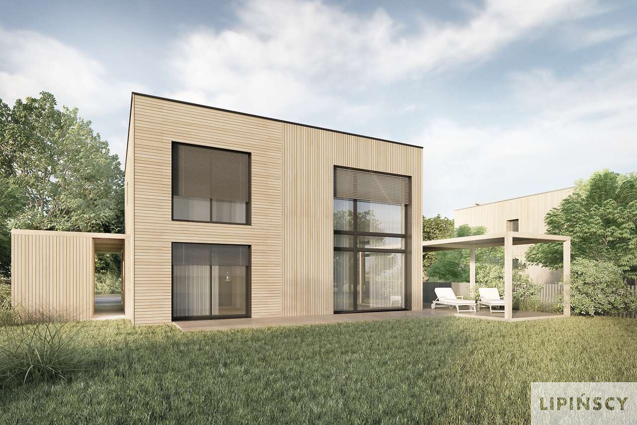 W tym domu wg projektu przyjęty jest tynk mineralny imitujący drewno. Prosimy o kontakt na biuro@lipinscy.pl w sprawie informacji dotyczących parametrów energetycznych.