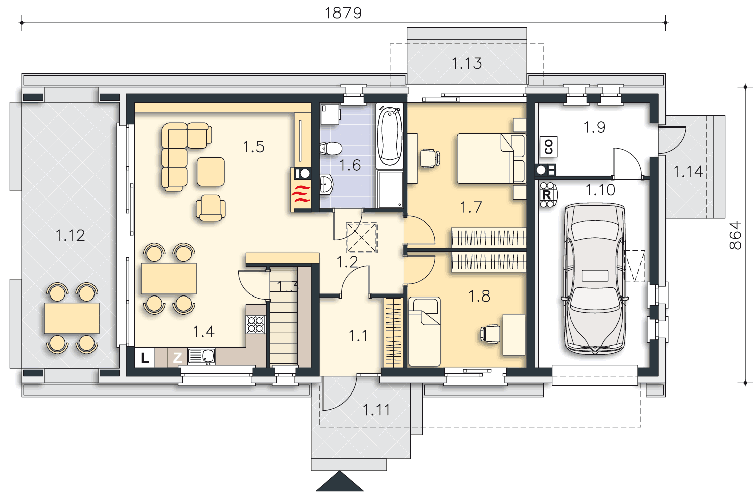 Doskonały, jednakże zadaszony taras bardzo szybko dodałbym do salonu poprzez pełne przeszklenie przedniej ściany. Czy samochód musi stać w bryle budynku? Nie, dlatego garaż zamieniłbym albo w pracownię, albo warsztat, albo osobny pokój z lazienką pod wynajem z wejściem prostopadłym do obecnego wjazdu samochodu.