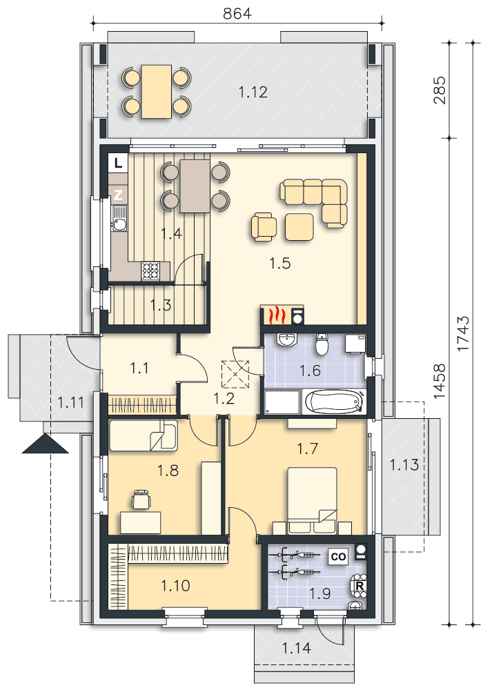 Można zmniejszyć taras wejściowy wtedy zamiast 4,8 m będzie 4 m.