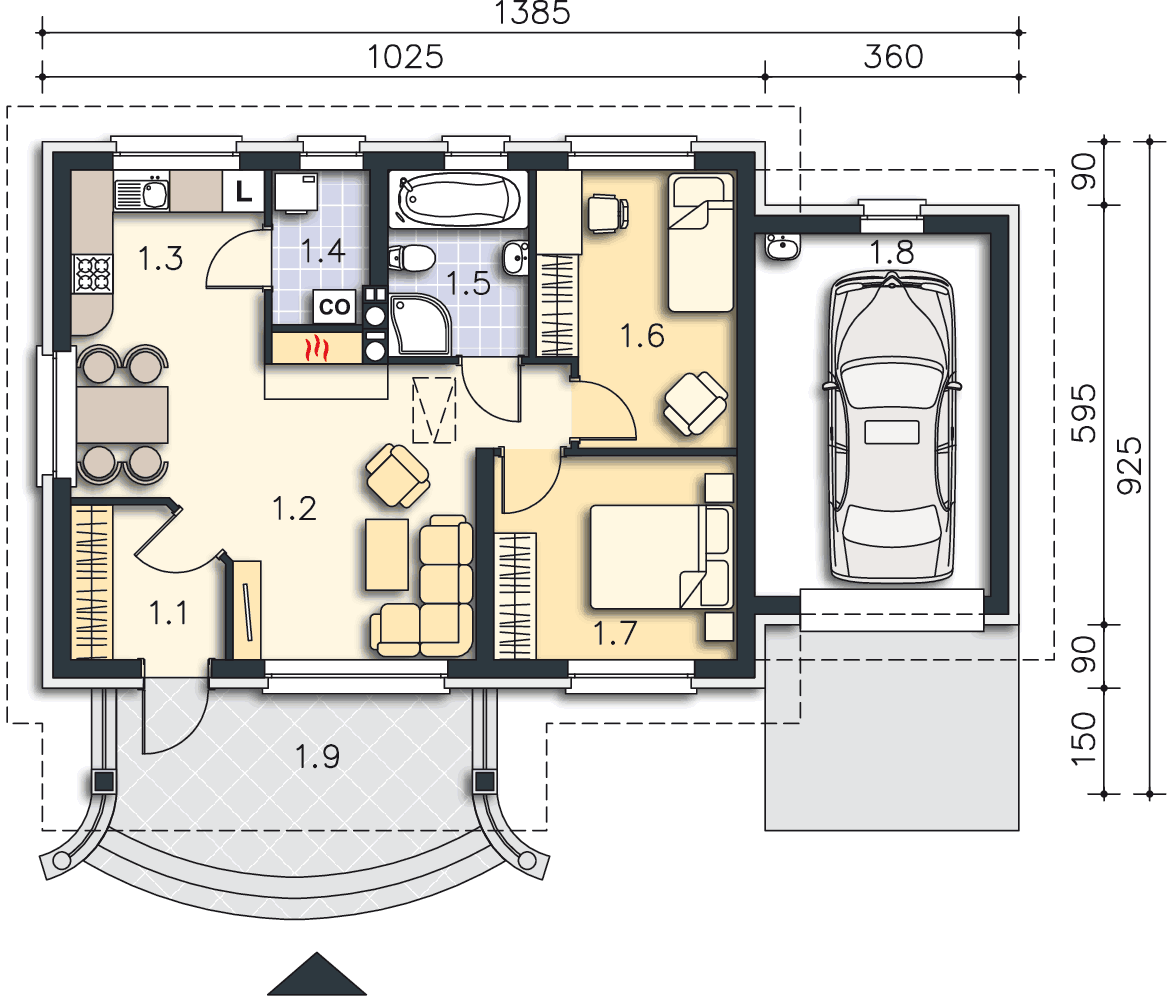 W tym projekcie jest przewidziane ogrzewanie gazowe. Wejście na strych nie jest przewidziane, ponieważ w tym domu nie ma poddasza.