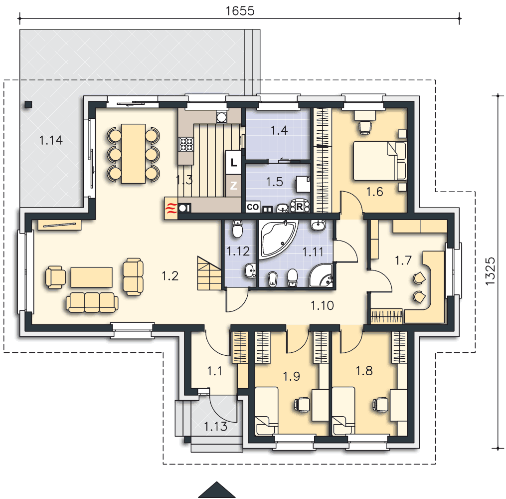 Planujemy zrobić podpiwniczenie pod częścią pomieszczeń czyli pod pom. kuchni z jadalnią , pom. gospodarczym i pokojem 1.5. Zejście byłoby usytuowane w pom. 1.4. Kotłownia byłaby pod pom. kuchni z jadalnią. Pan wprowadzający zmiany zaproponował ustawienie komina po prawej stronie bezpośrednio przy wejściu z salonu. Czy istnieje inna możliwość ustawienia komina by nie psuło efektu wizualnego pomieszczenia i efektywnego rozmieszczenia mebli kuchennych oprócz ustawienia komina w narożniku kuchni. W pom.1.4 prawdopodobnie byłaby możliwość usytuowania komina tylko przy schodach zabiegowych, a nie dwubiegowych. Zaznaczam, że w tym pomieszczeniu będzie również wejście na strych.