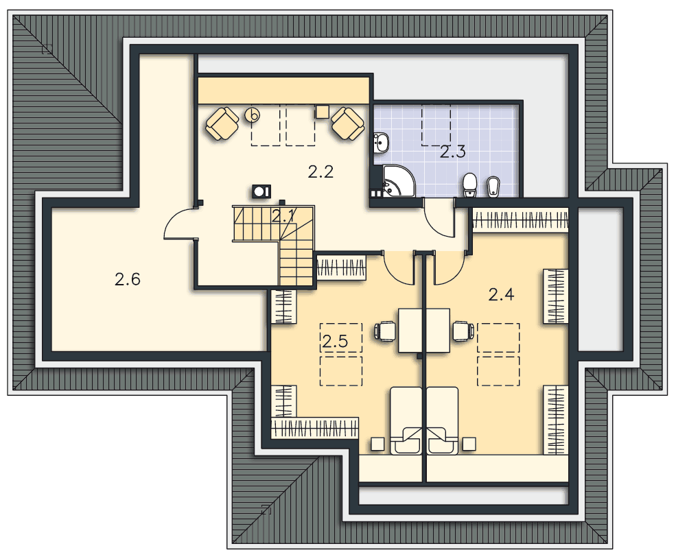 Na poddaszu największy pokój ma kształt odwróconej litery L, i bez problemu jest tam miejsce na aneks kuchenny połączony z salonem, mam też łazienkę, garderobę i dwie sypialnie.