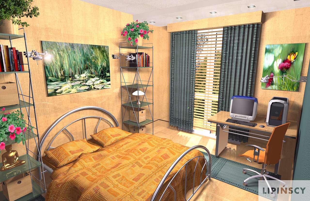 pokój około 10,5m2 z wejsciem z salonu i pomieszczenie gospodarcze do którego przejscie jest z kuchni.