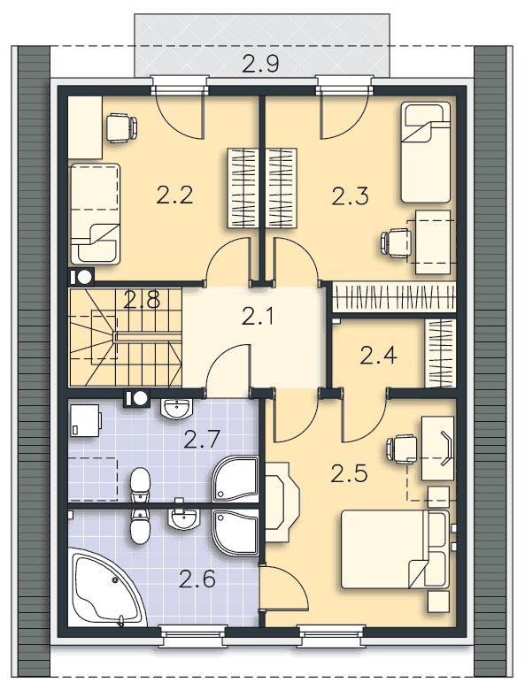 - jeśli chodzi o poddasze to zapewne nie ma problemu ze zmianą układu (chciałbym jedną ale większą wspólną łazienkę) i dodatkowo okna dachowe do sypialni 2.6.