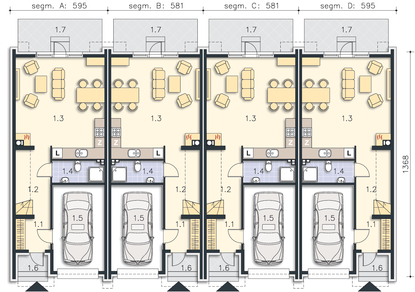 Można zrealizować jeden segment jako dom wolnostojący. Teoretycznie wystarczy do tego działka o szer. 9 m. Ale zalezy to również od warunków zabudowy.
