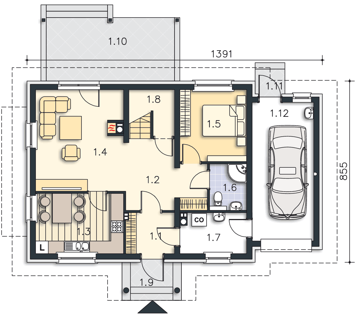 Można zrezygnować ze ścianek działowych przy kuchni i 1.2, salon wtedy będzie się wydawał większy. Kuchnia też jest większa, niż w Vigo. Wejście do sypialni na parterze można zrobić od strony schodów, a łazienkę powiększyć o korytarzyk przed nią.