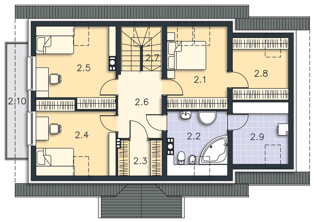 Czy można kuchnię otworzyć całkowicie na salon i komunikację 1.2? Czy można wejście do pokoju 1.5 przenieść na sąsiednia ścianę (od strony schodów) aby powiększyć nieco łazienkę? Czy rzeczywiście konieczne jest tak dużo okien dachowych? Czy nie wystarczyłoby jedno nad klatką 2.7 plus powiększenie okien w 2.1 i 2.2? Pokoje 2.4 i 2.5 wydają się być dostatecznie doświetlone (u mnie wychodziłyby na południowy zachód).