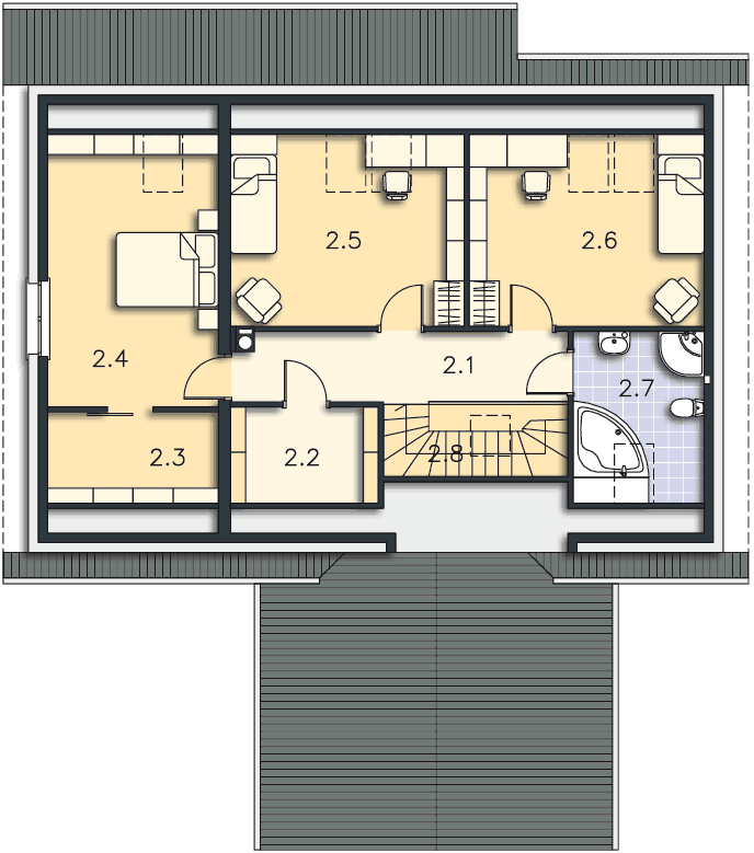 3. na górze rezygnować z okien połaciowych a co za tym idzie - ustawić 2 sypialnie po lewej (teraz tam jest sypialnia z garderobą), 3 sypialnia tam gdzie jest - dzięki temu wstawi się okna w ścianach szczytowych