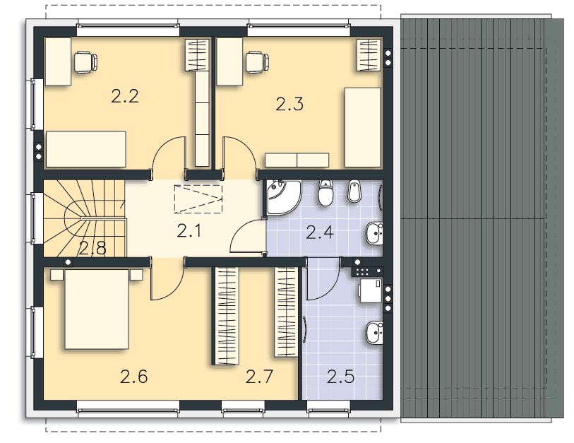 Tak. Zamieniając ze schodami łazienkę u góry konieczne będzie wejście do 2.5 z sypialni.