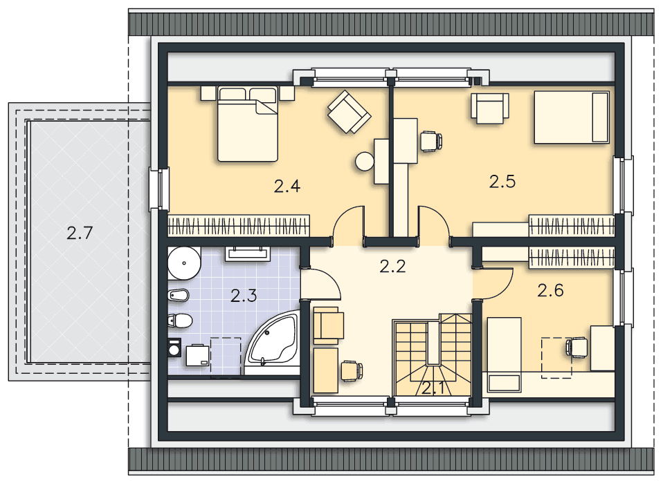 Można pozostawić większe sypialnie jeśli inwestor tak zdecyduje. Przesunięcie ściany również jest możliwe. Zapraszamy do kontaktu bezpośredniego w celu przygotowania wyceny: biuro@lipinscy.pl