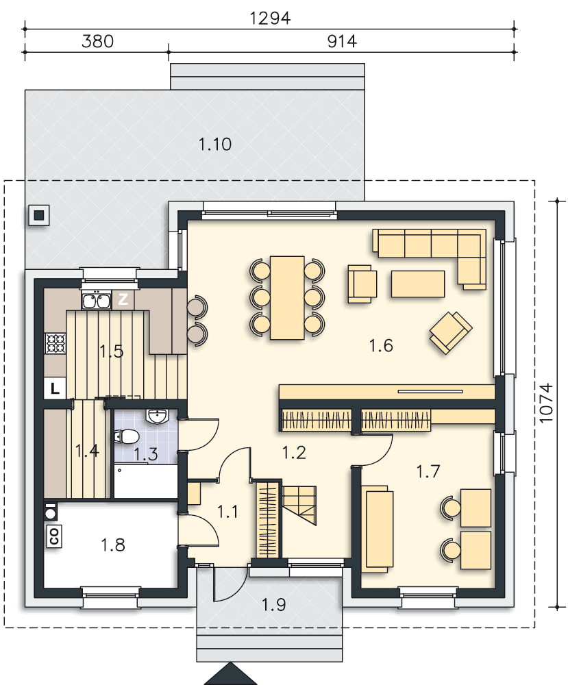 Można doprojektować kominek np. przy ścianie salonu od strony pom. 1.2 i 1.7