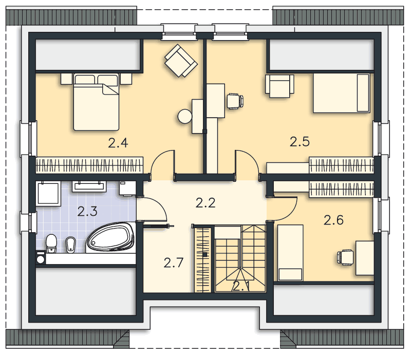 Można pozostawić większe sypialnie jeśli inwestor tak zdecyduje. Przesunięcie ściany również jest możliwe. Zapraszamy do kontaktu bezpośredniego w celu przygotowania wyceny: biuro@lipinscy.pl