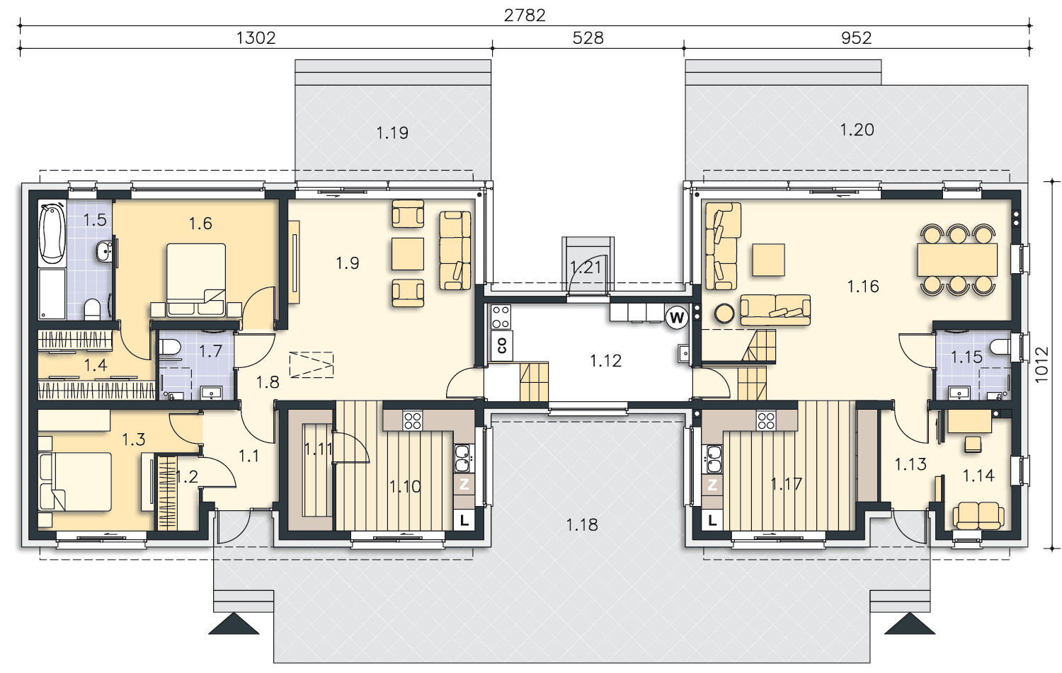 Można zlikwidować okna na ścianie szczytowej i wówczas przysunąć ją na 3 m do granicy - minimalna szerokość wyniesie 19 m.