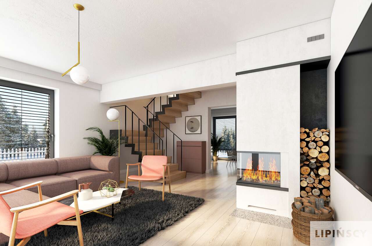 Kominek nie jest dobrym pomysłem w domach pasywnych ze względu na szczelność budynku. Garaż można powiększyć - nie wpłynie to negatywnie na budynek. Stół można przenieść w miejsce telewizora. Telewizor może pod schodami? Różnica w wymiarach salonu dotyczy powierzchni pod schodami, która jest nieużytkowa.