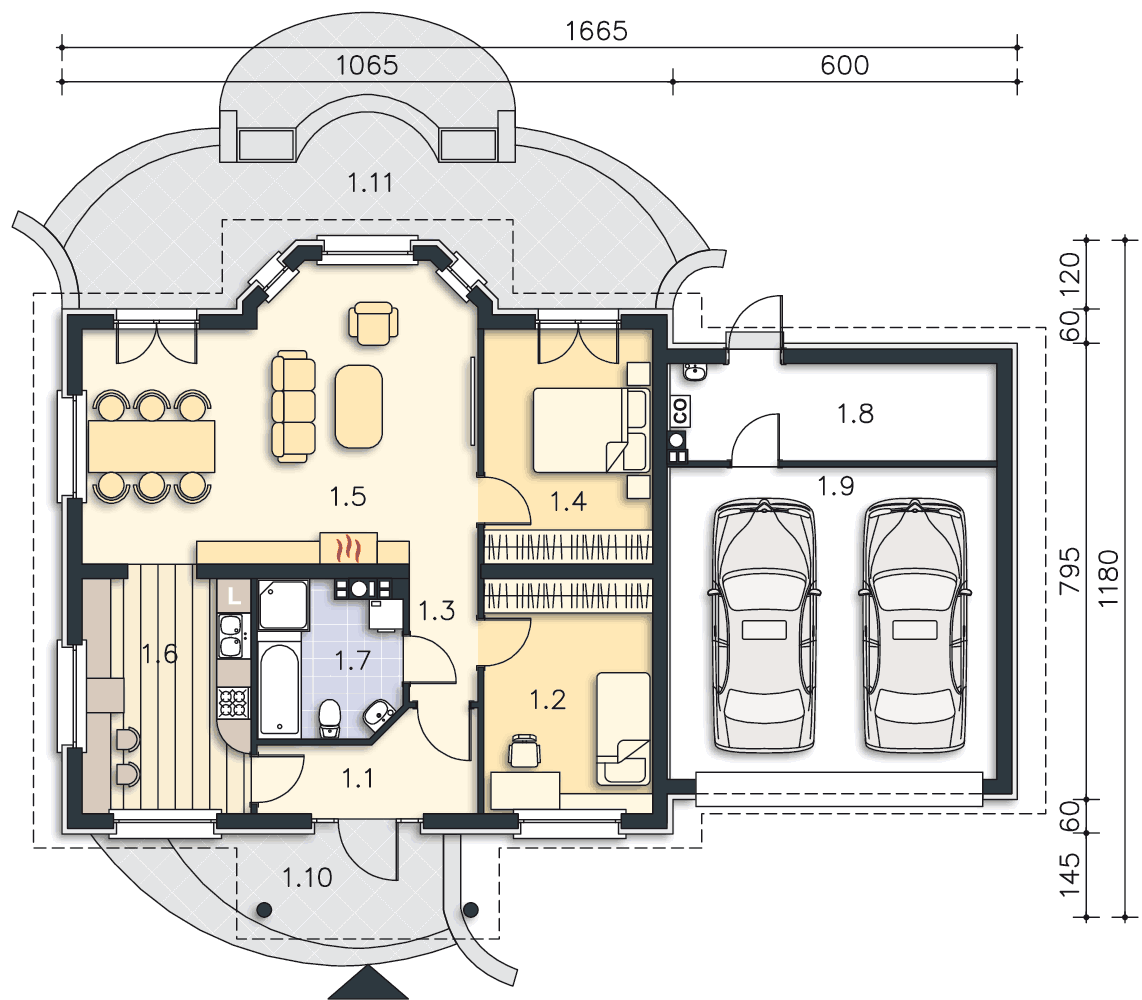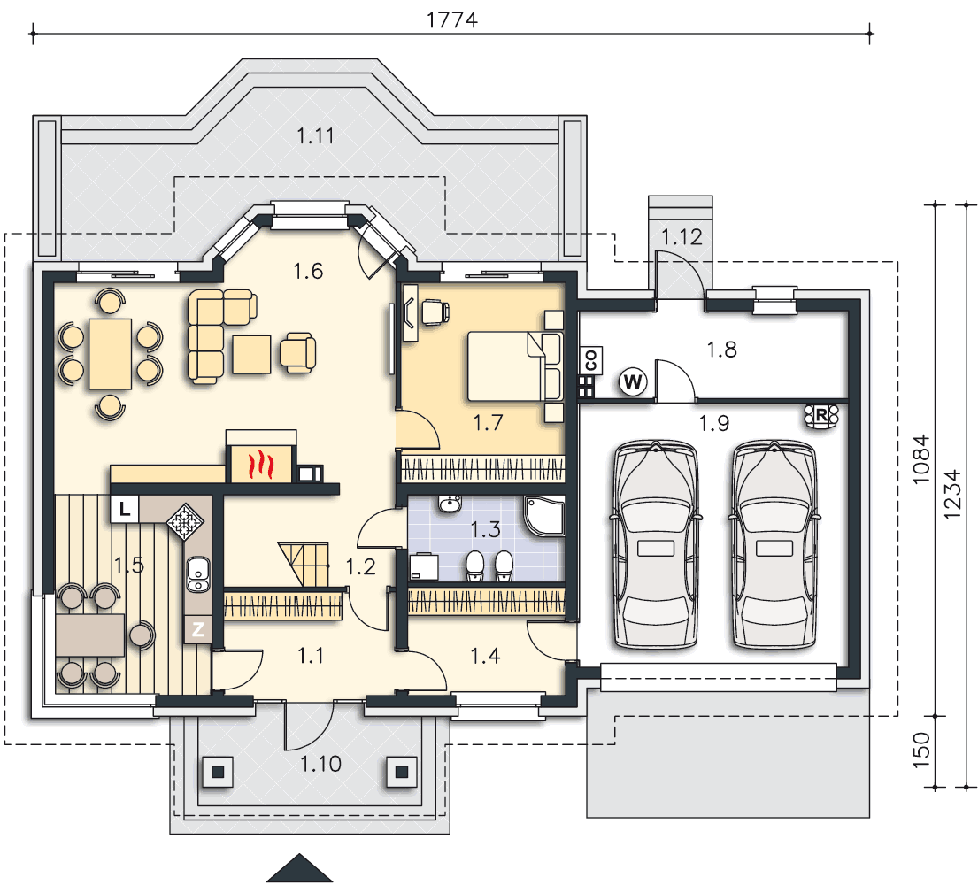 Ten projekt ma możliwość wygospodarowania trzeciego pokoju. Proponujemy zrobić aneks kuchenny w miejscu jadalni, a w miejscu kuchni powstanie w ten sposób wygodny pokój. Można także przenieść kuchnię w miejsce pokoju 1.4 i zrezygnować ze ścianki między nią i salonem, a wówczas zamiast jadalni zrobić odrębny pokój. Tak naprawdę możliwości jest wiele, ponieważ wszystkie ścianki działowe można dowolnie kształtować, zostawiając nienaruszoną jedynie ścianę nośną, idącą przez oś domu. Takie zmiany nie wymagają naszej zgody, a może je wprowadzić każdy architekt w ramach adaptacji.