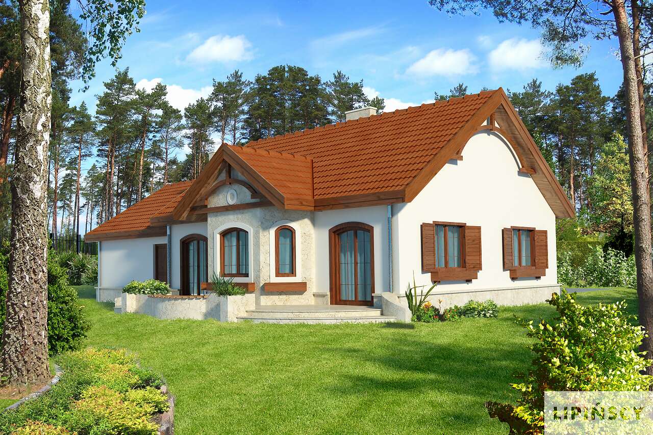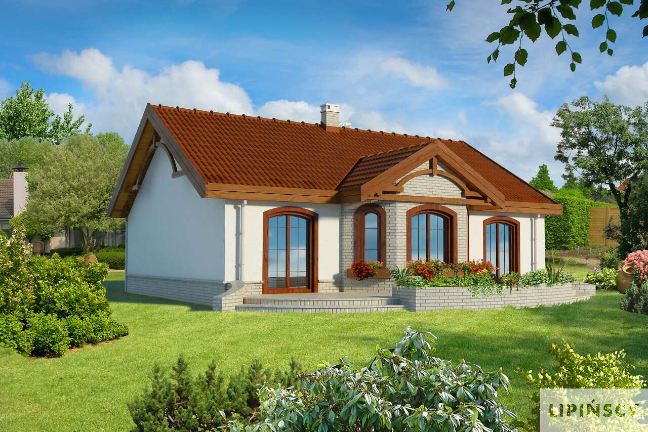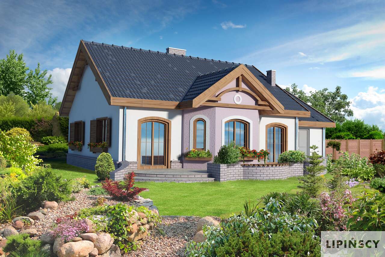 Niewielki domek parterowy z dwuspadowym dachem. Uroku dodają kolumienki z przodu budynku. Jeszcze bardziej podoba mi się jego tył. Piękne tarasy i oszklenia. Środek wydaje mi się praktyczny. Duża kuchnia, jasny salon i dwa pokoje.