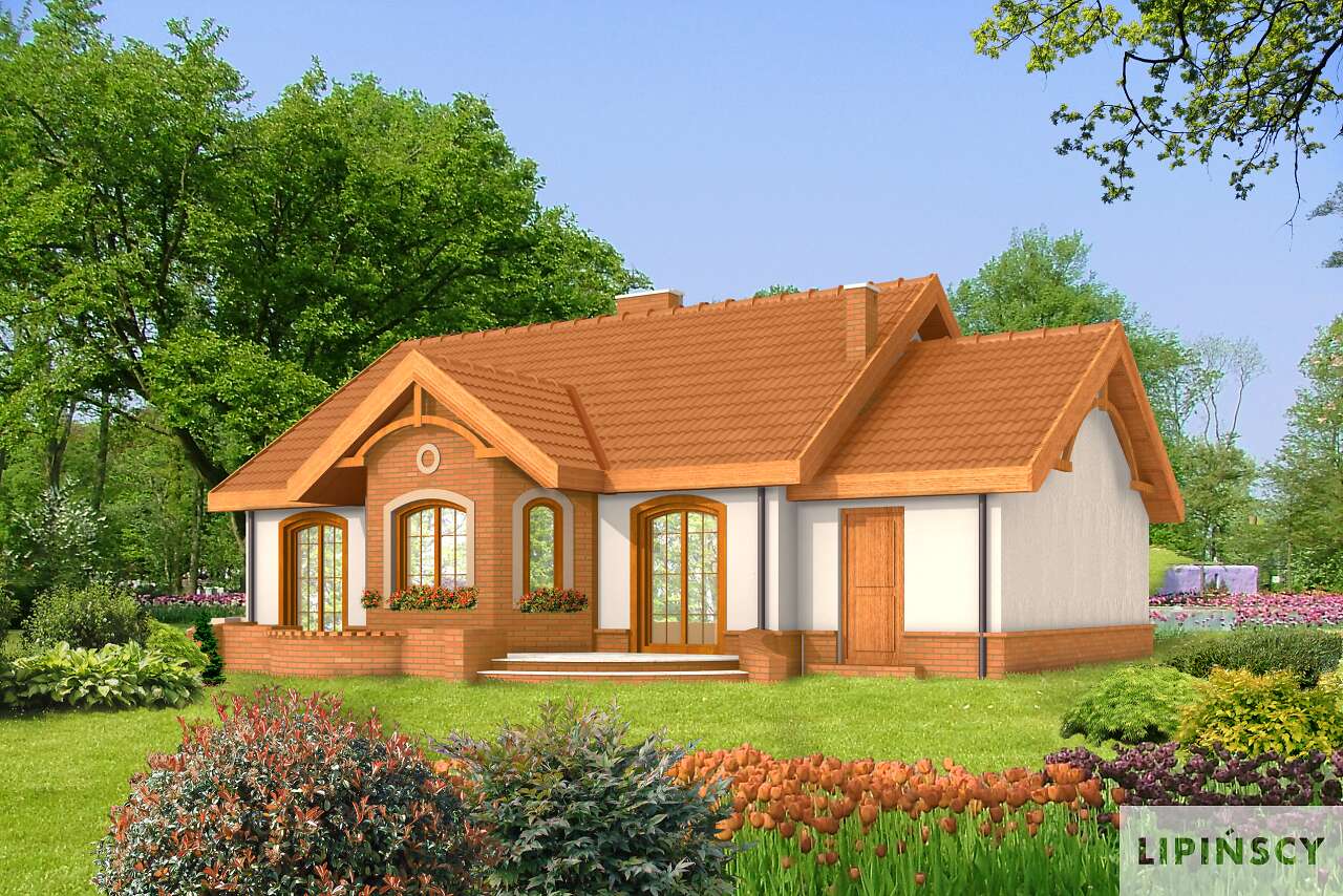 Niewielki domek parterowy z dwuspadowym dachem. Uroku dodają kolumienki z przodu budynku. Jeszcze bardziej podoba mi się jego tył. Piękne tarasy i oszklenia. Środek wydaje mi się praktyczny. Duża kuchnia, jasny salon i dwa pokoje.